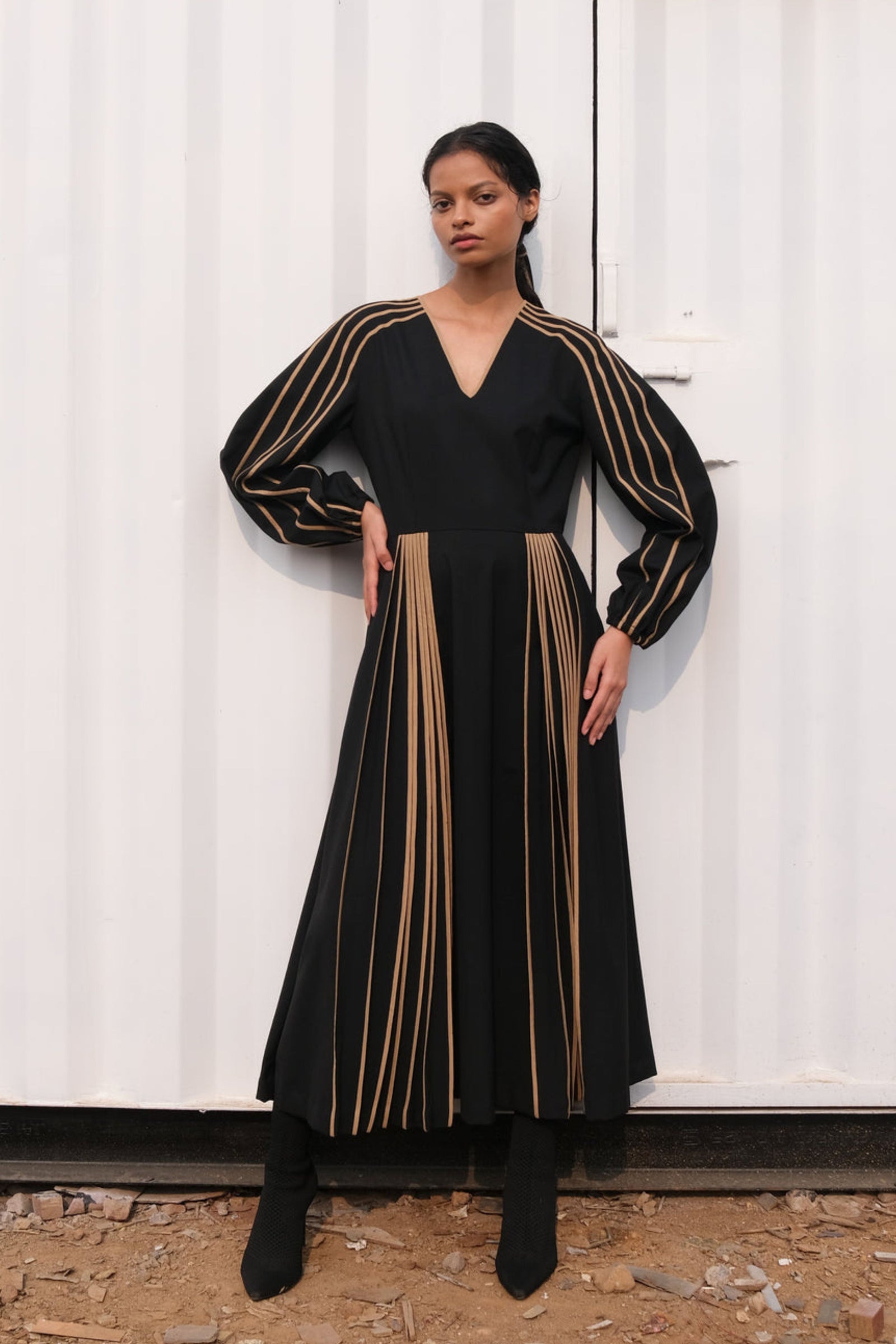 • V neck half sleeves dress with binding detail in viscose crepe.