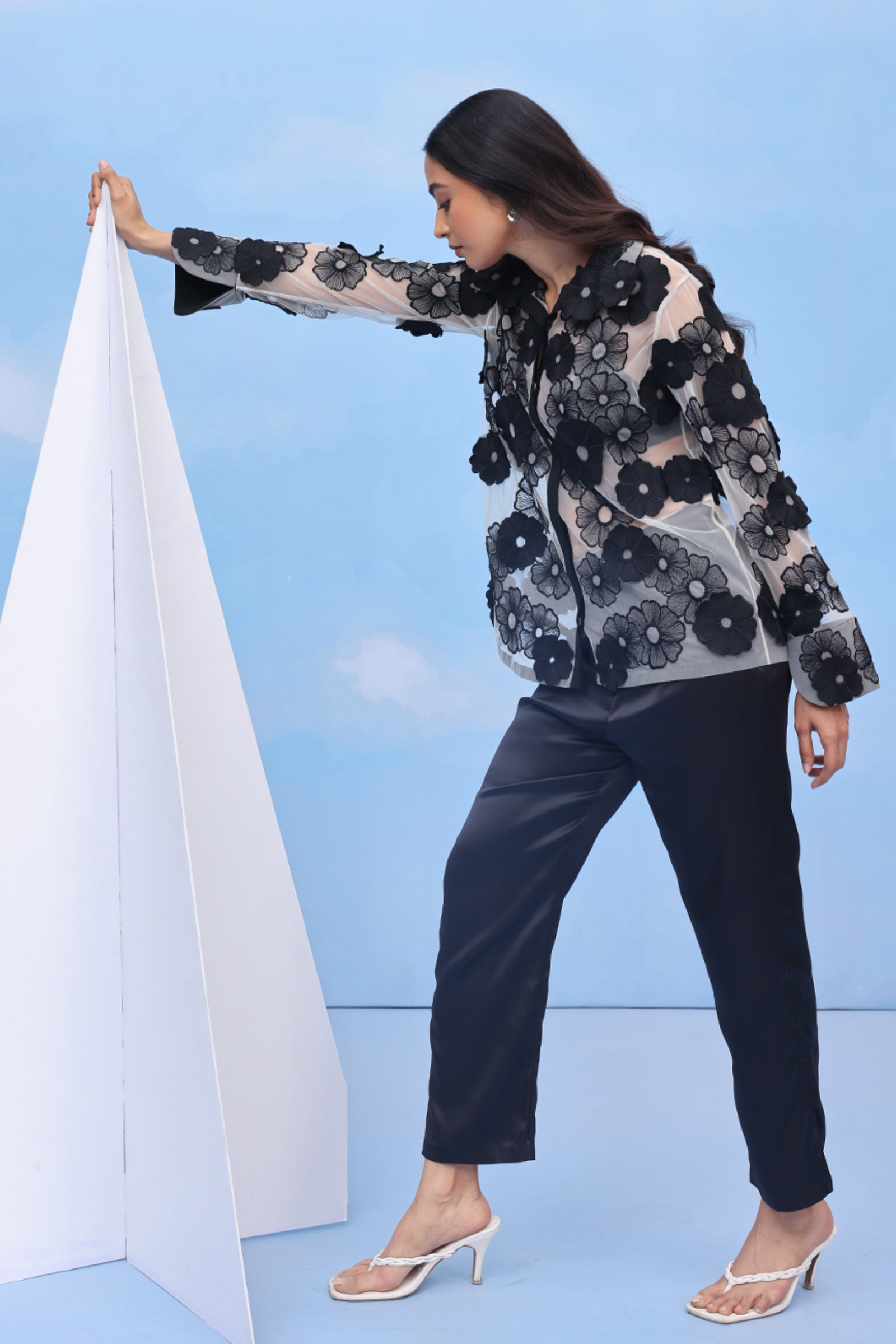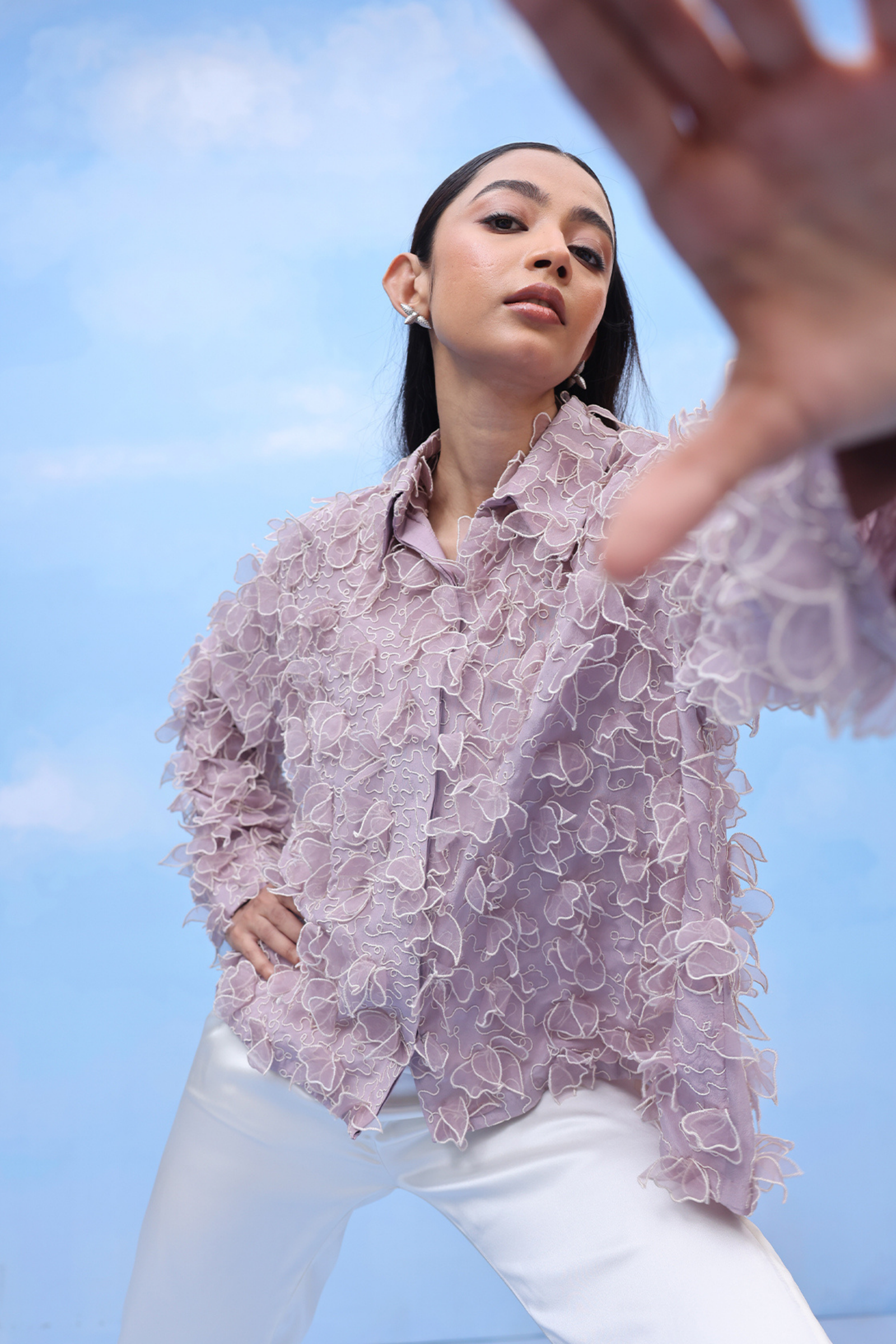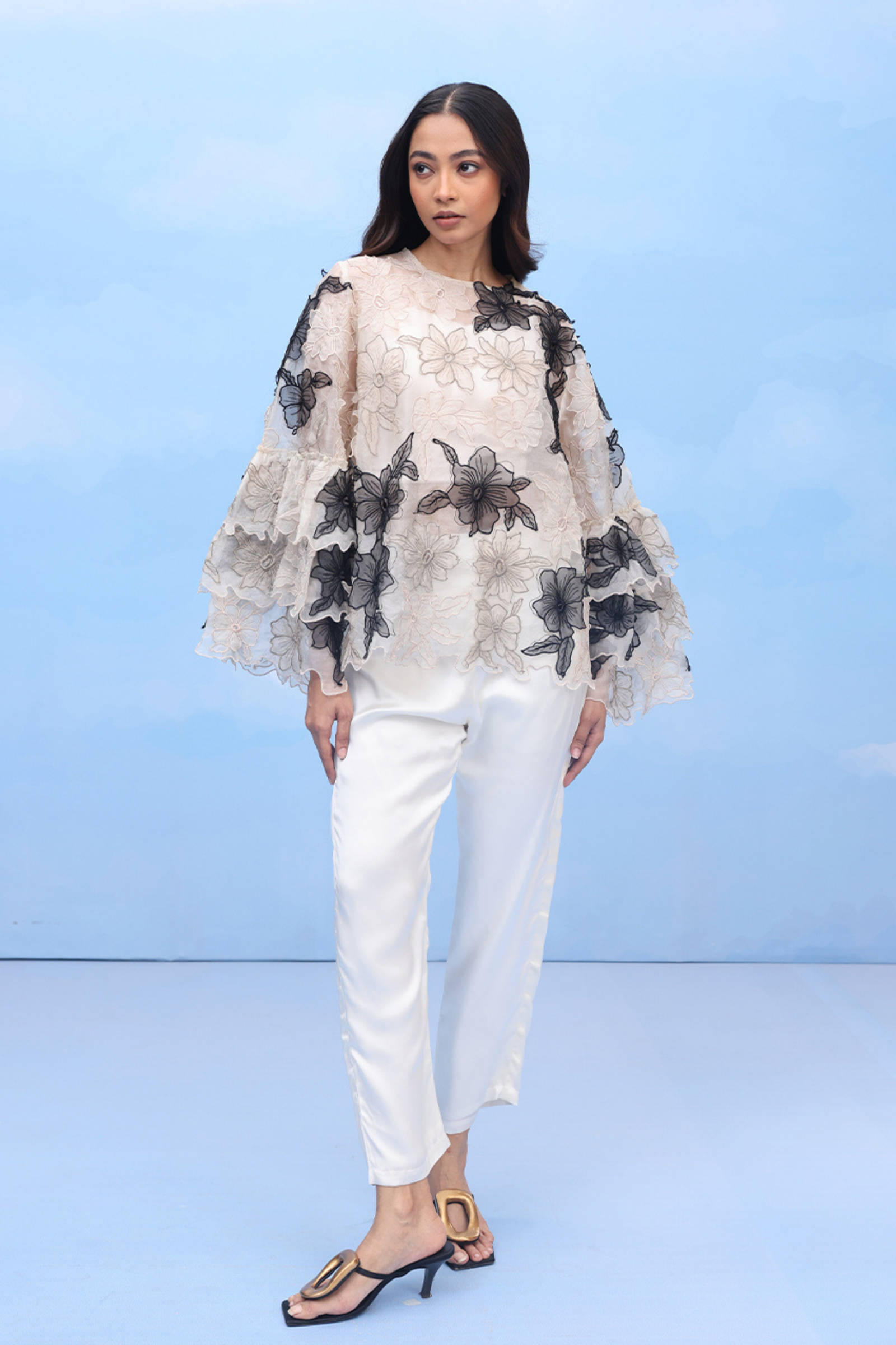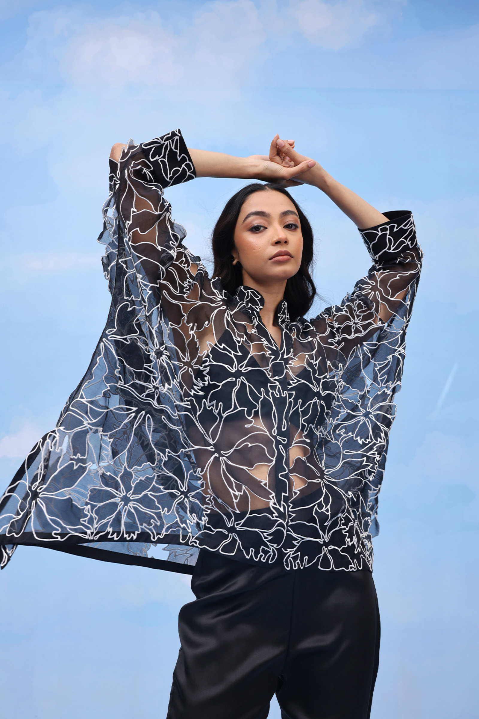 • An oversized swing shirt with machine embroidery and velvet patchwork on crepe. Includes side slits for flare and panelled cuff sleeves for an added on detail.