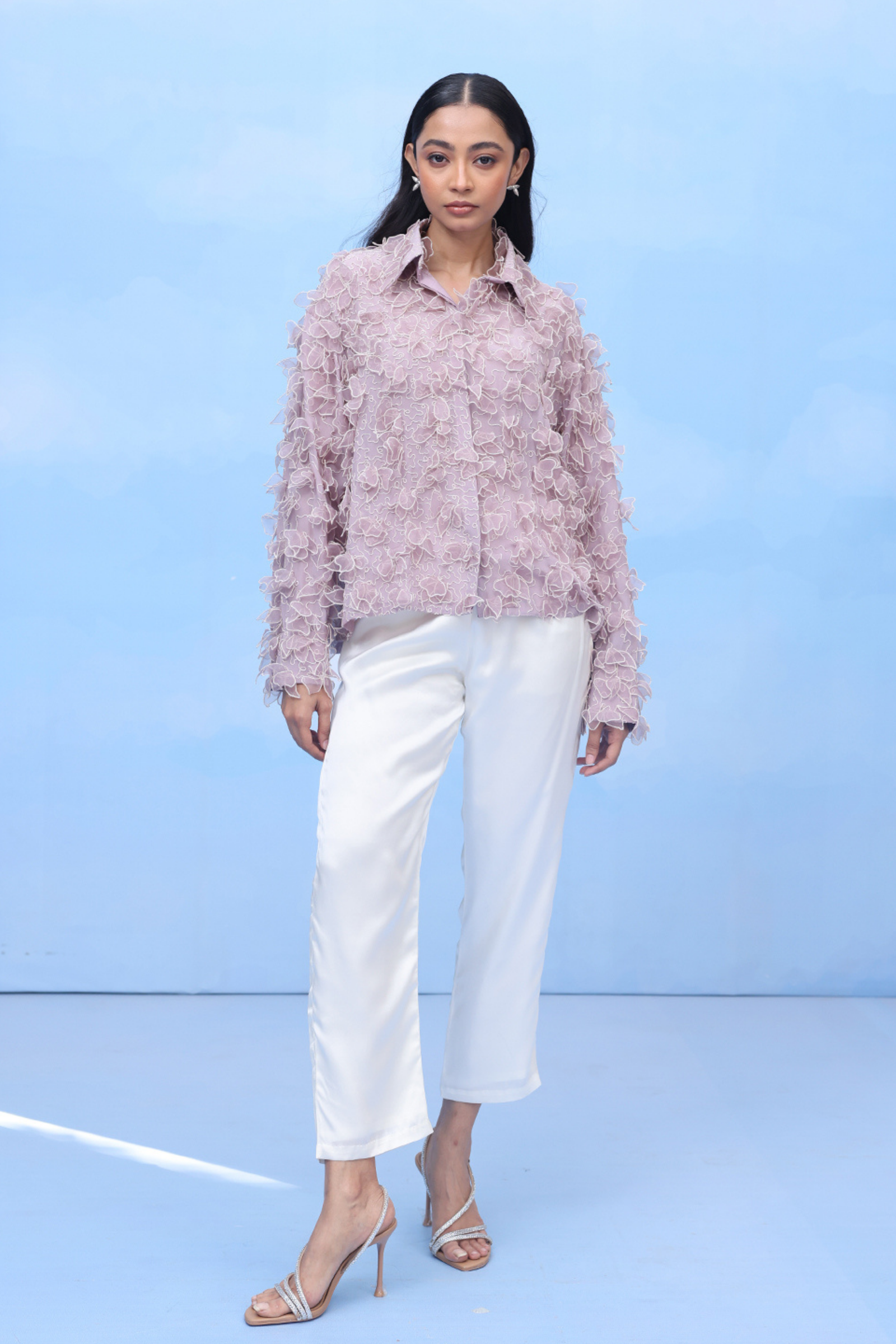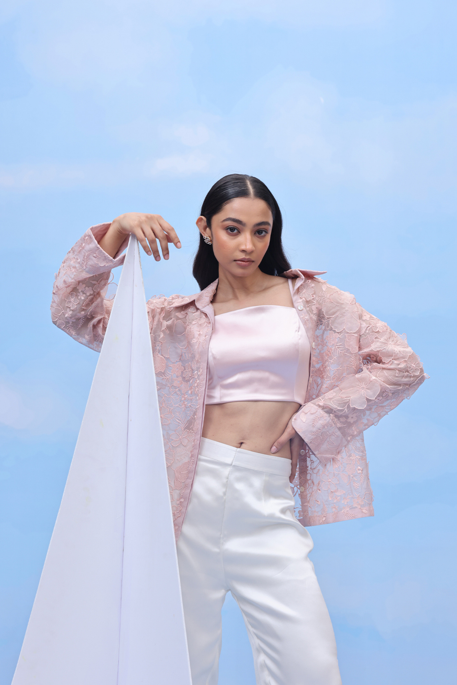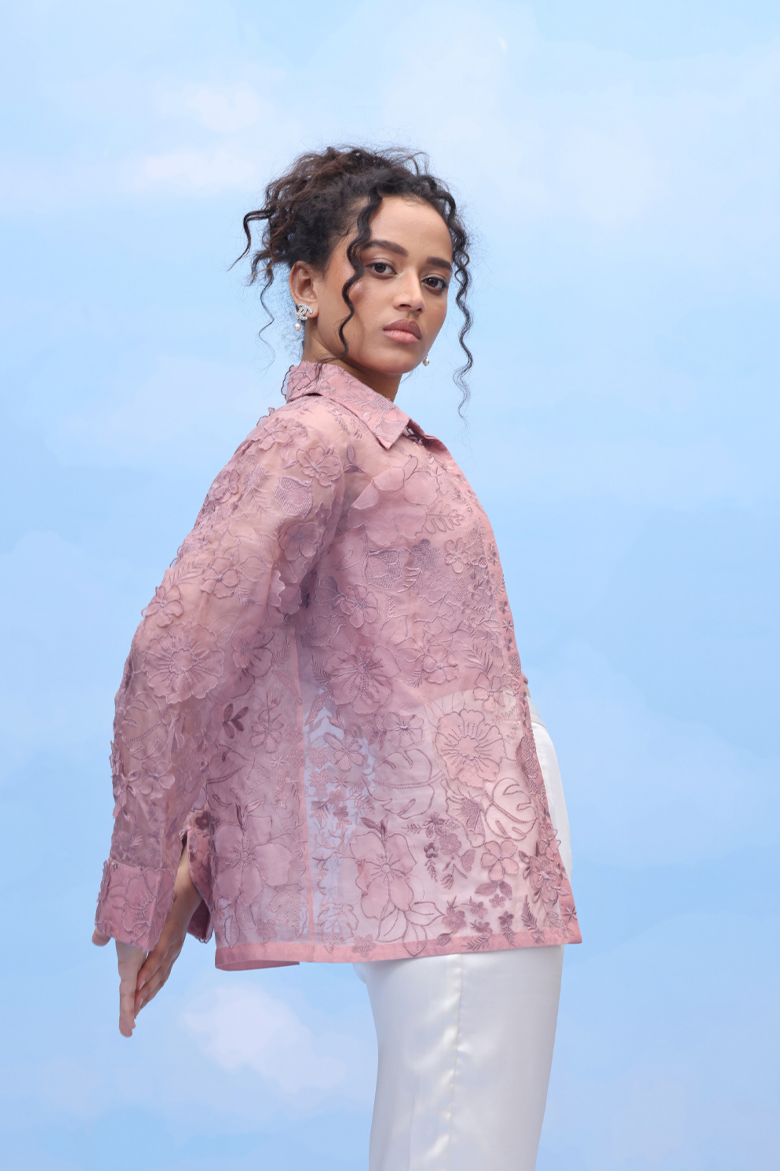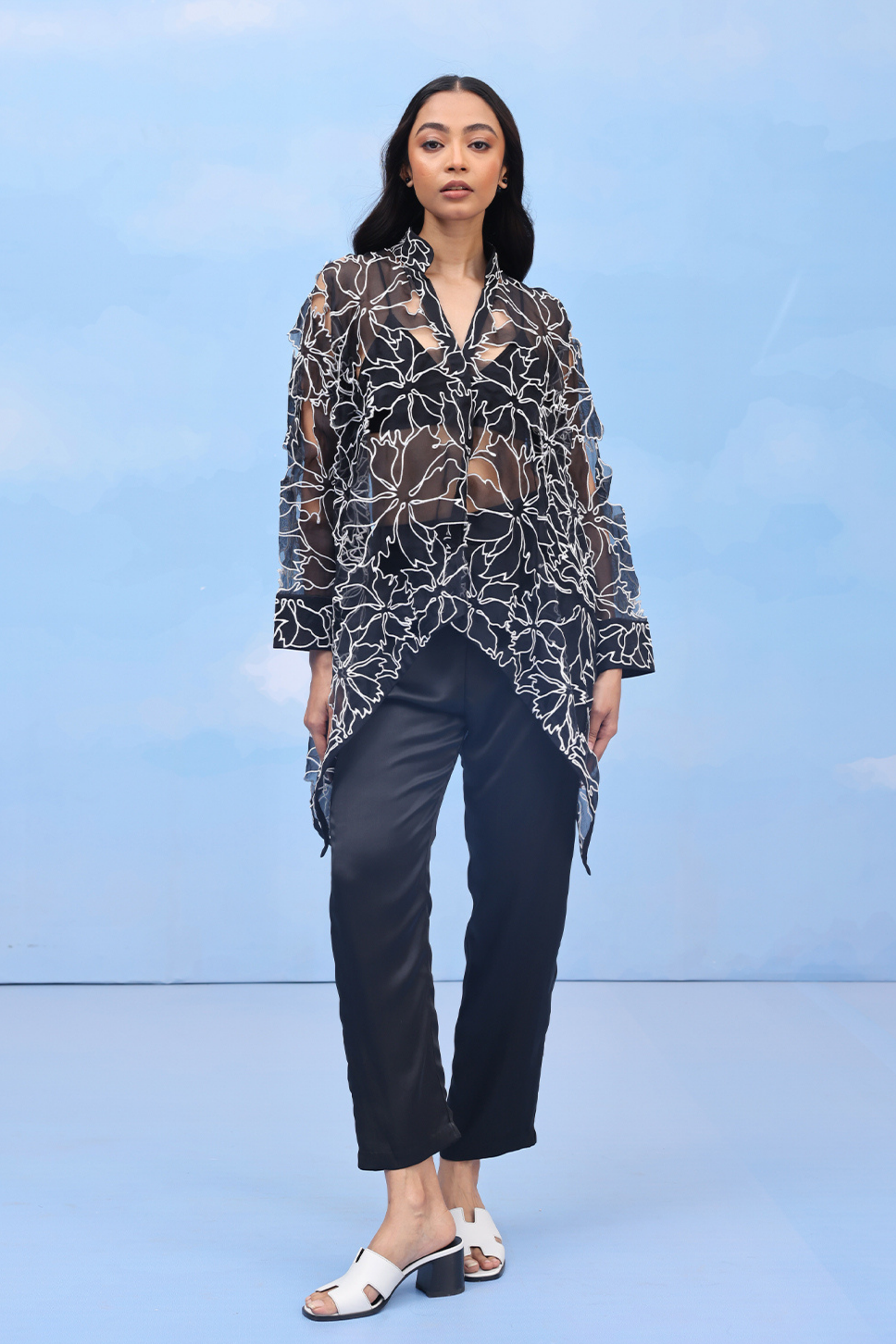 • An oversized swing shirt with machine embroidery and velvet patchwork on crepe. Includes side slits for flare and panelled cuff sleeves for an added on detail.