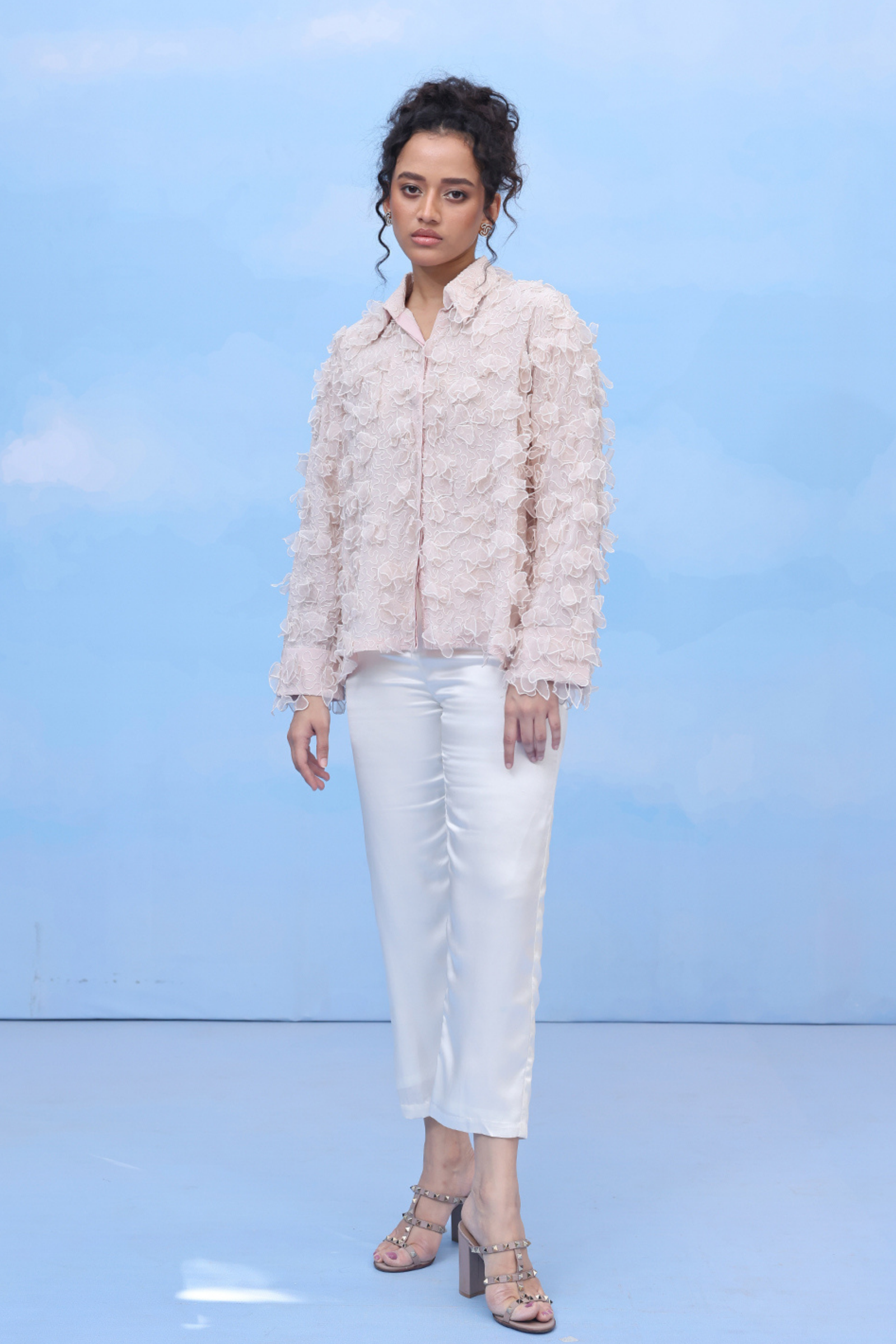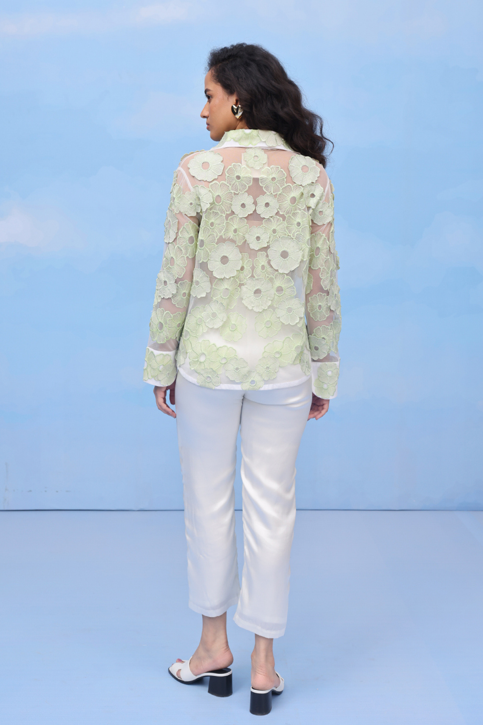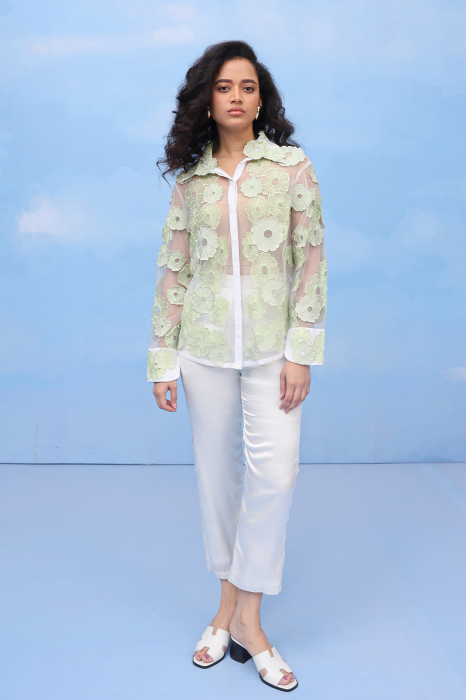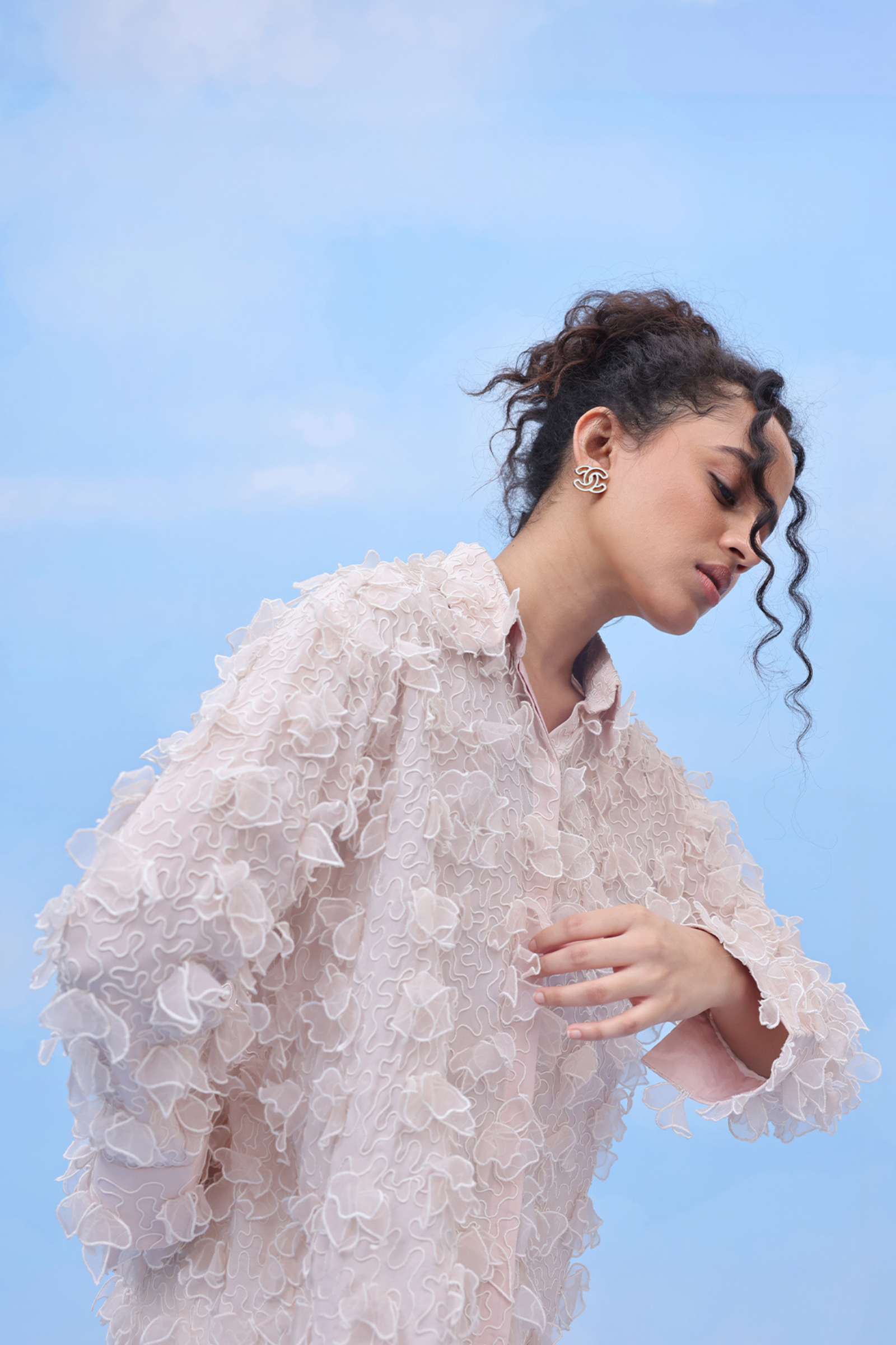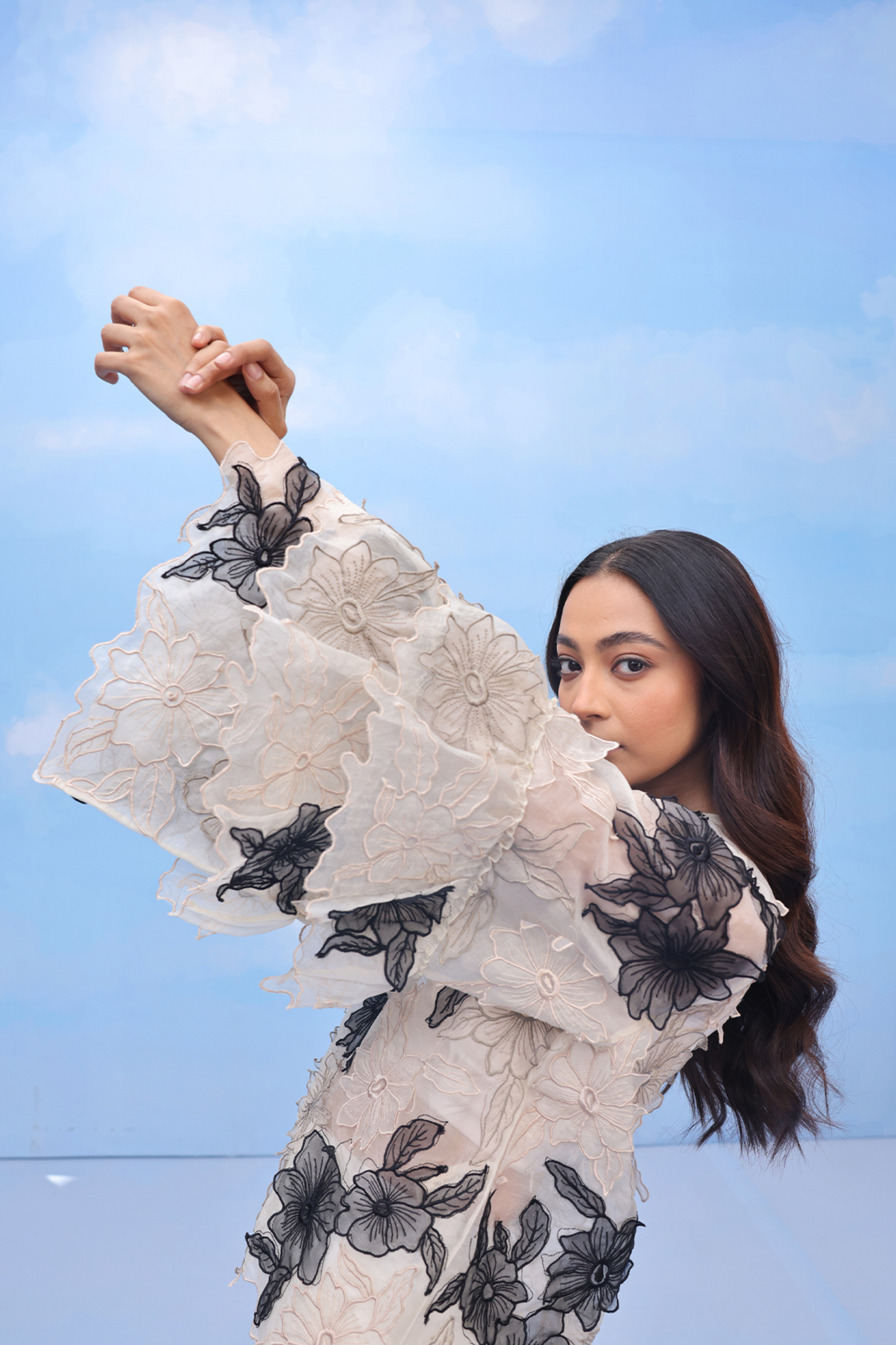 • An oversized swing shirt with machine embroidery and velvet patchwork on crepe. Includes side slits for flare and panelled cuff sleeves for an added on detail.