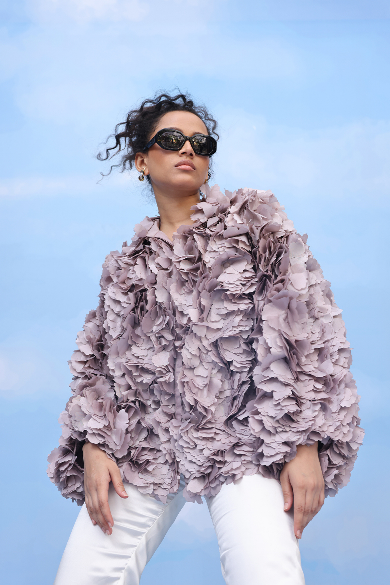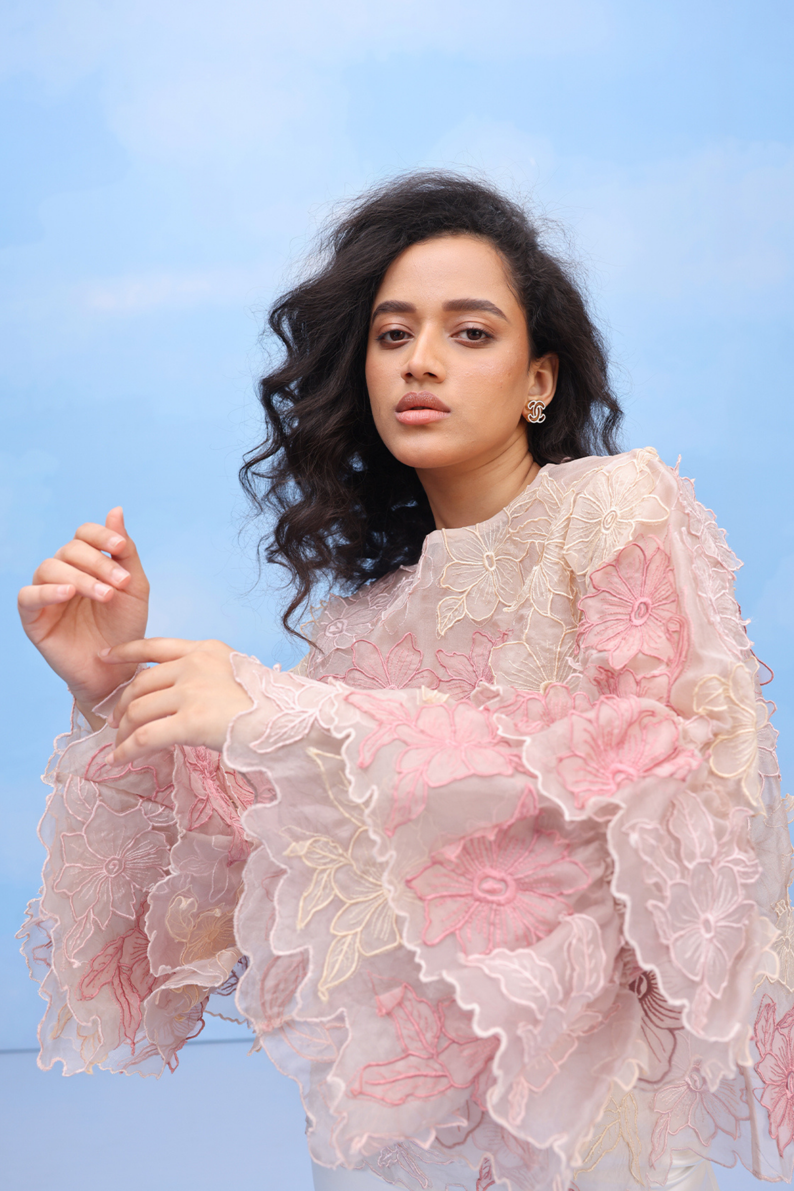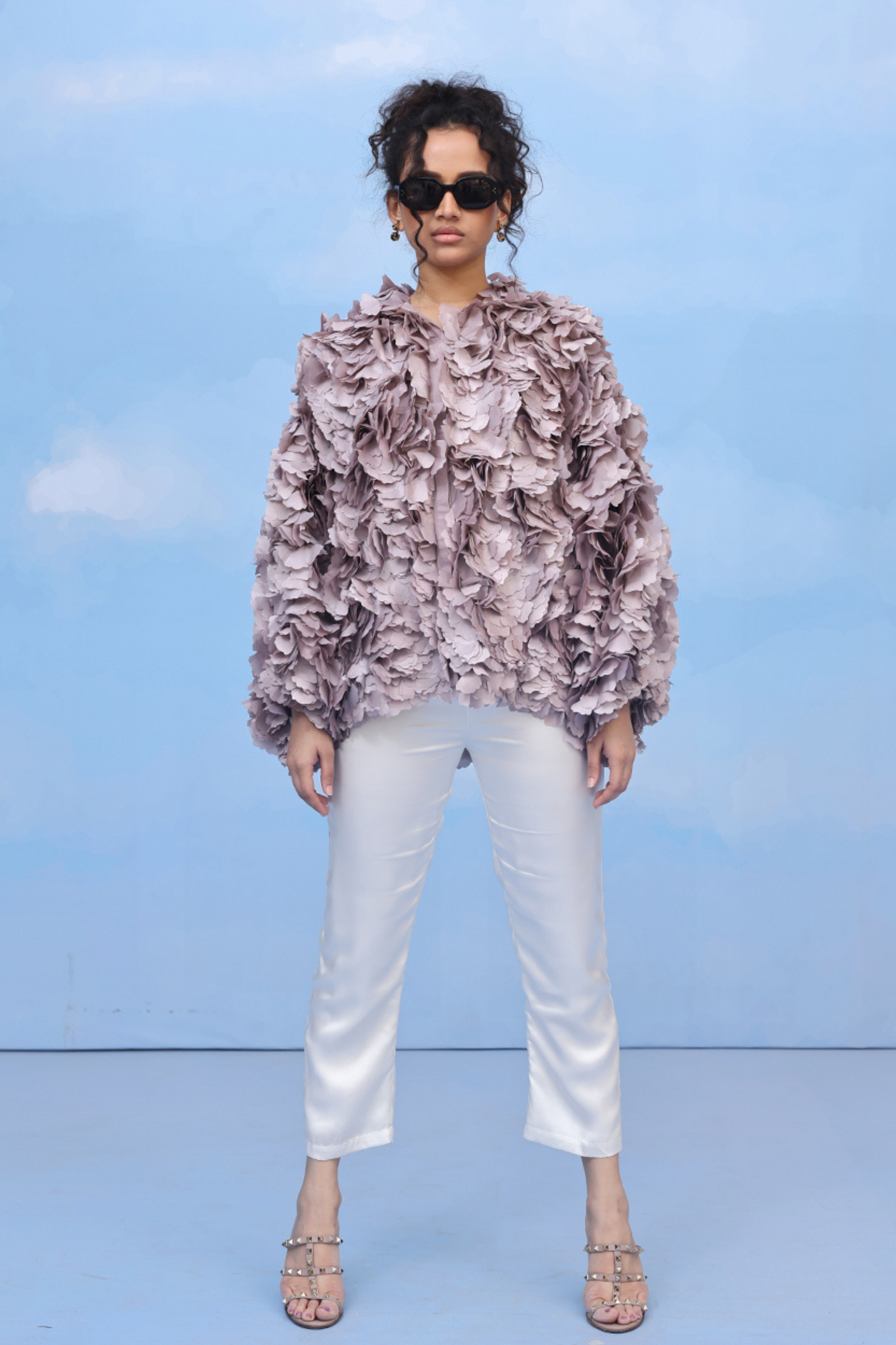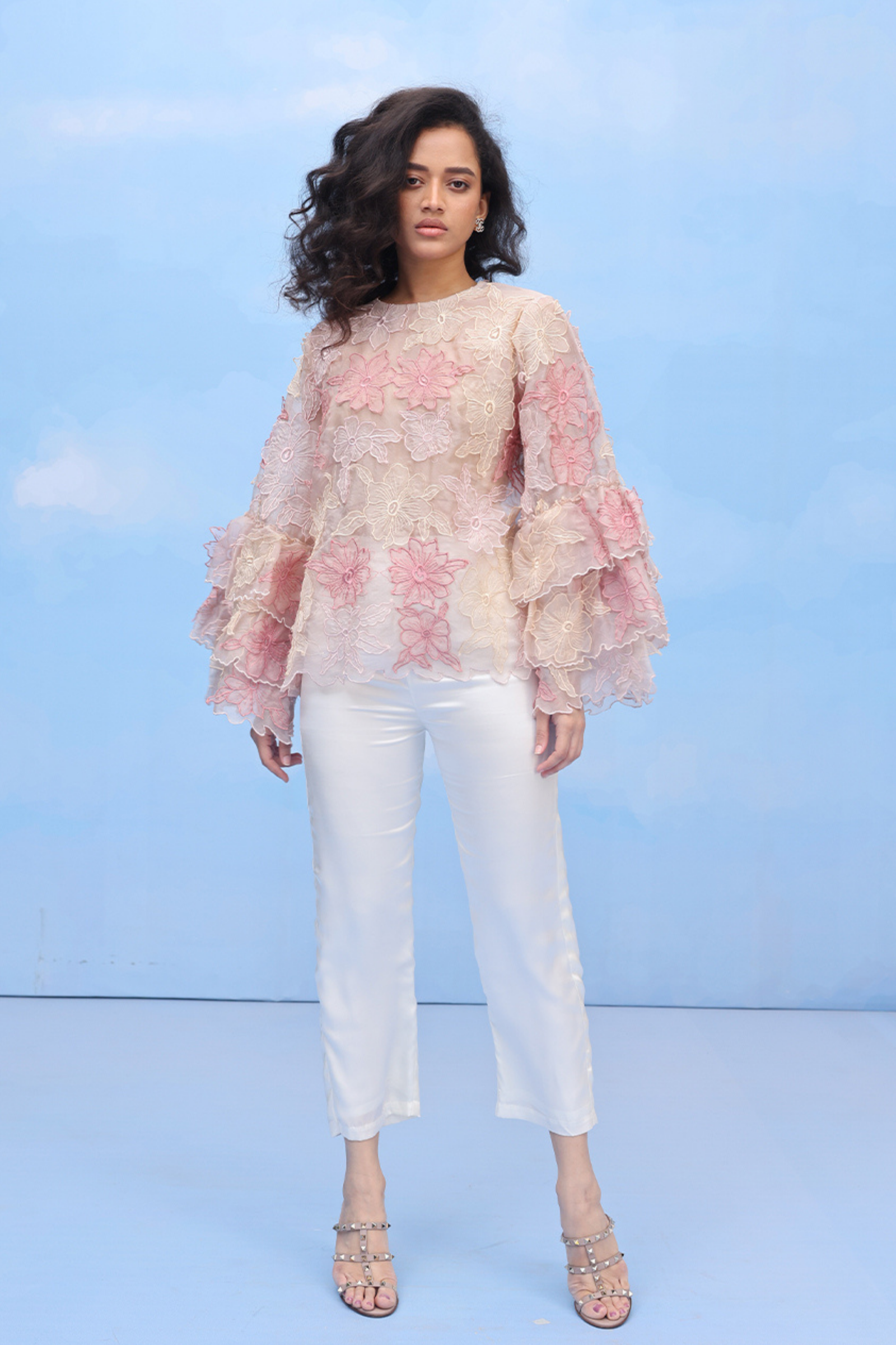 • An oversized swing shirt with machine embroidery and velvet patchwork on crepe. Includes side slits for flare and panelled cuff sleeves for an added on detail.