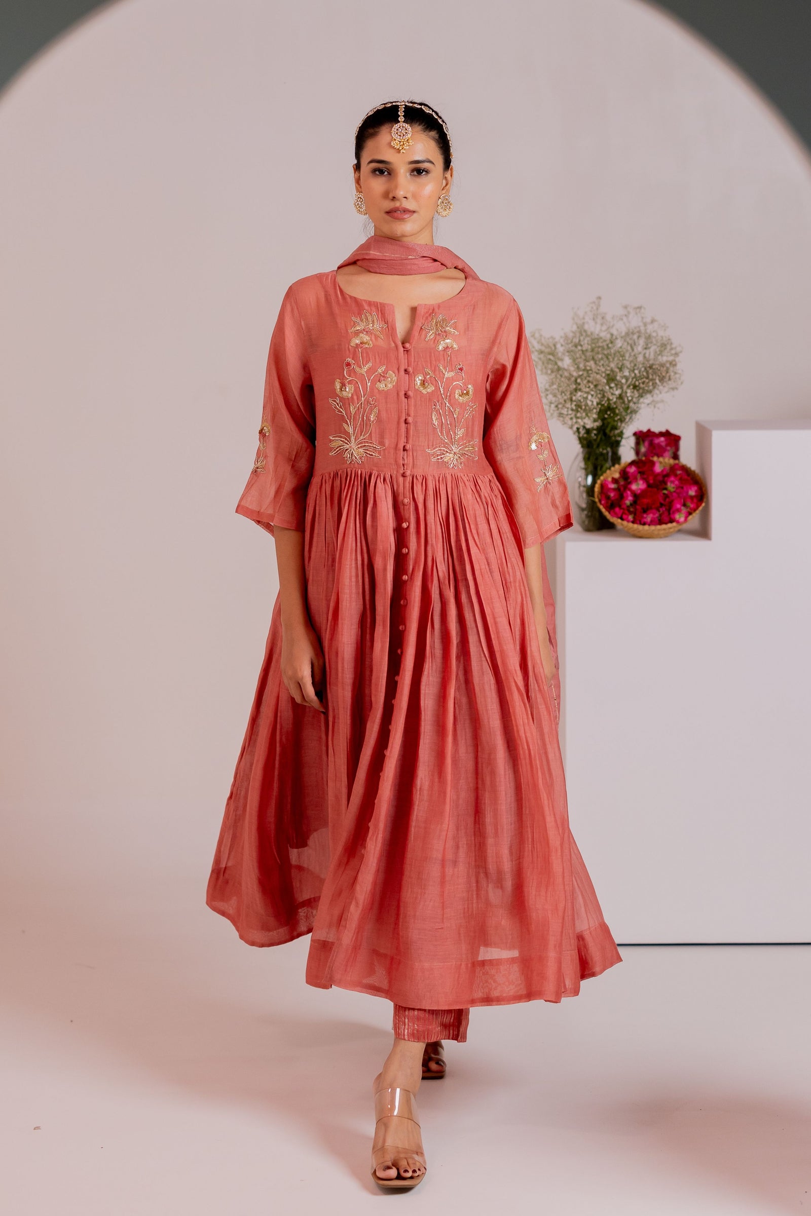 • Step into the spotlight with this regal maroon chanderi embroidered kaftan. This ensemble combines comfort and style with its flowing silhouette and rich deep tone, perfect for festive events or formal dinners. The kaftan is beautifully adorned with intricate embroidery and beading along the neckline and sleeves, making it a statement piece for any occasion. Kurta is fully lined with cotton mulmul fabric. The standard kurta length - 46"