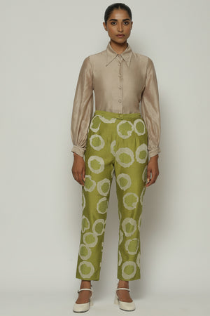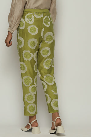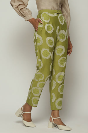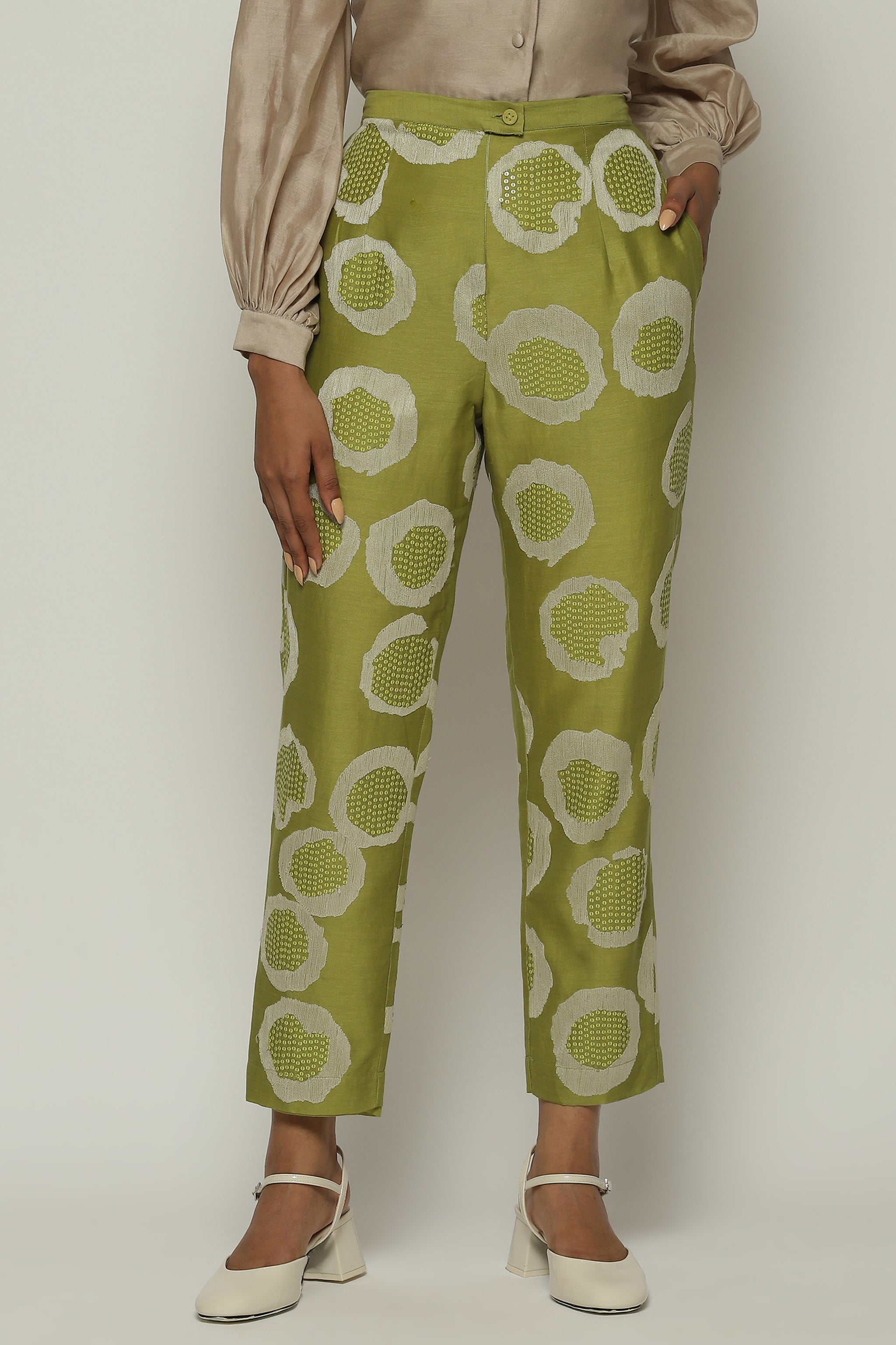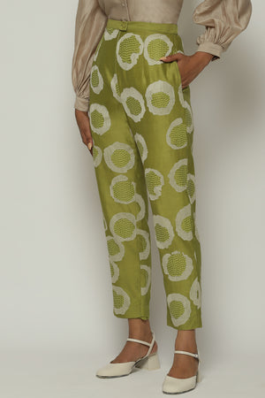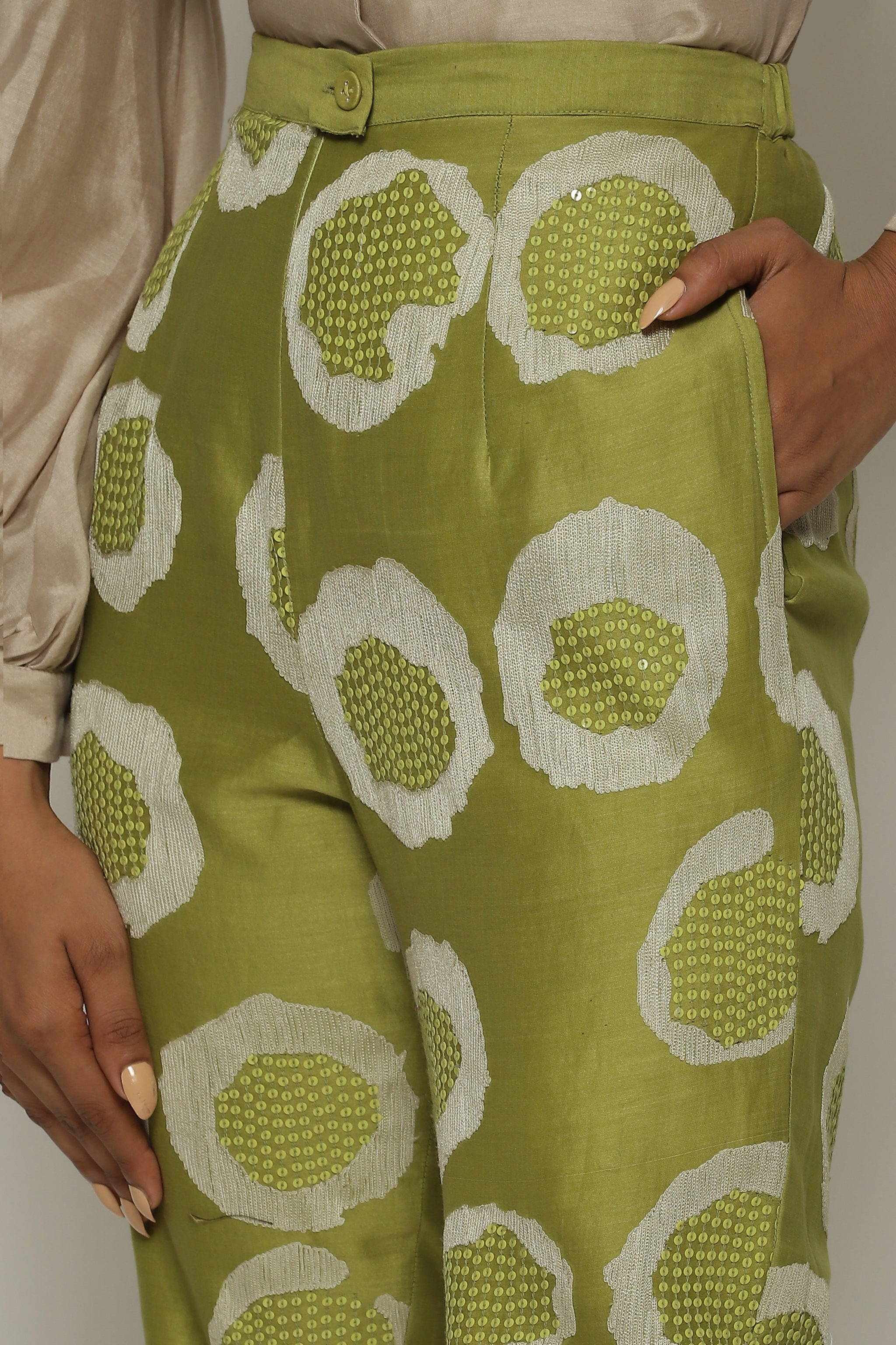 • A pair of tapered amla pants, featuring sequins and aari rings.Crafted in a lightweight Chanderi, this piece features the ancient arts of crewel and hand adda embroidery. Happiest with its co ord top, but also versatile enough to be worn with other shirts.