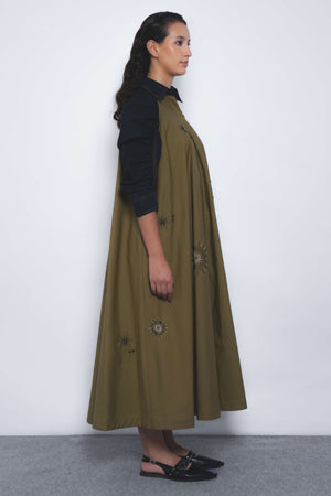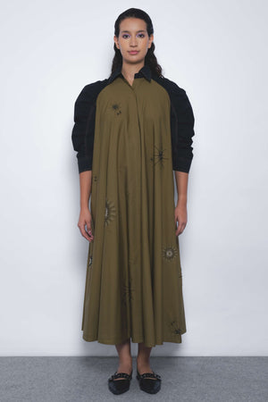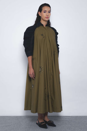 • This midi dress features voluminous contrast puff sleeves and is adorned with hand-embellished firework motifs in beadwork, creating a striking visual and tactile effect.