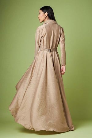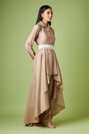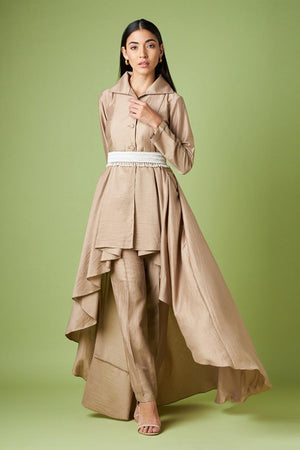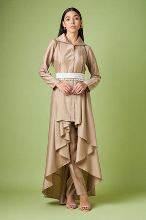 • Almond draped tunic cord set with pearl embellished belt . Solid beige blazer tunic collar neck and front button closure full sleeves and asymmetric high-low hemline paired with a matching straight pant with an elasticated back waist comes with a pearl embellished belt with an elasticated back and metal closure accented with delicate drapes