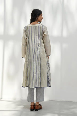 • Round neck tunic featuring a medley of stripes and solids patched together. The armhole and sleeves are embroidered with delicate hand stitches and the hem and sleeves are highlighted by contrast selvedge details.