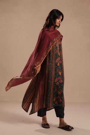 • A maroon habutai stole with contrasting yellow borders and floral accents. Highlighted with prints in yellow and pink, it’s designed to instantly elevate everyday kurta sets. The Dupatta length-95'' and the Dupatta width-19''