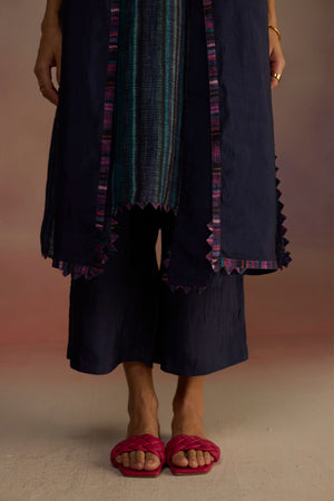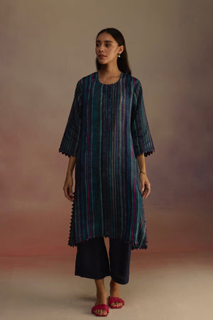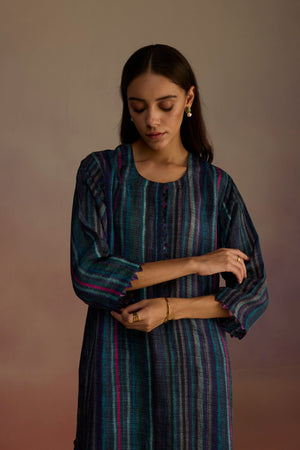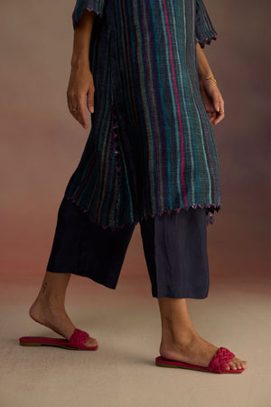 • The set features a habutai silk a-line kurta adorned with hand-sketched stripes in festive hues, paired with wide-legged pants. The kurta features hand cut detailing across the front placket.