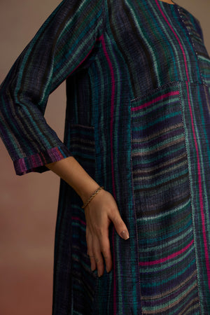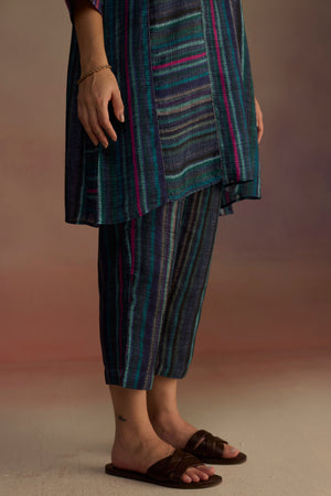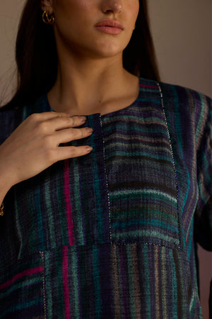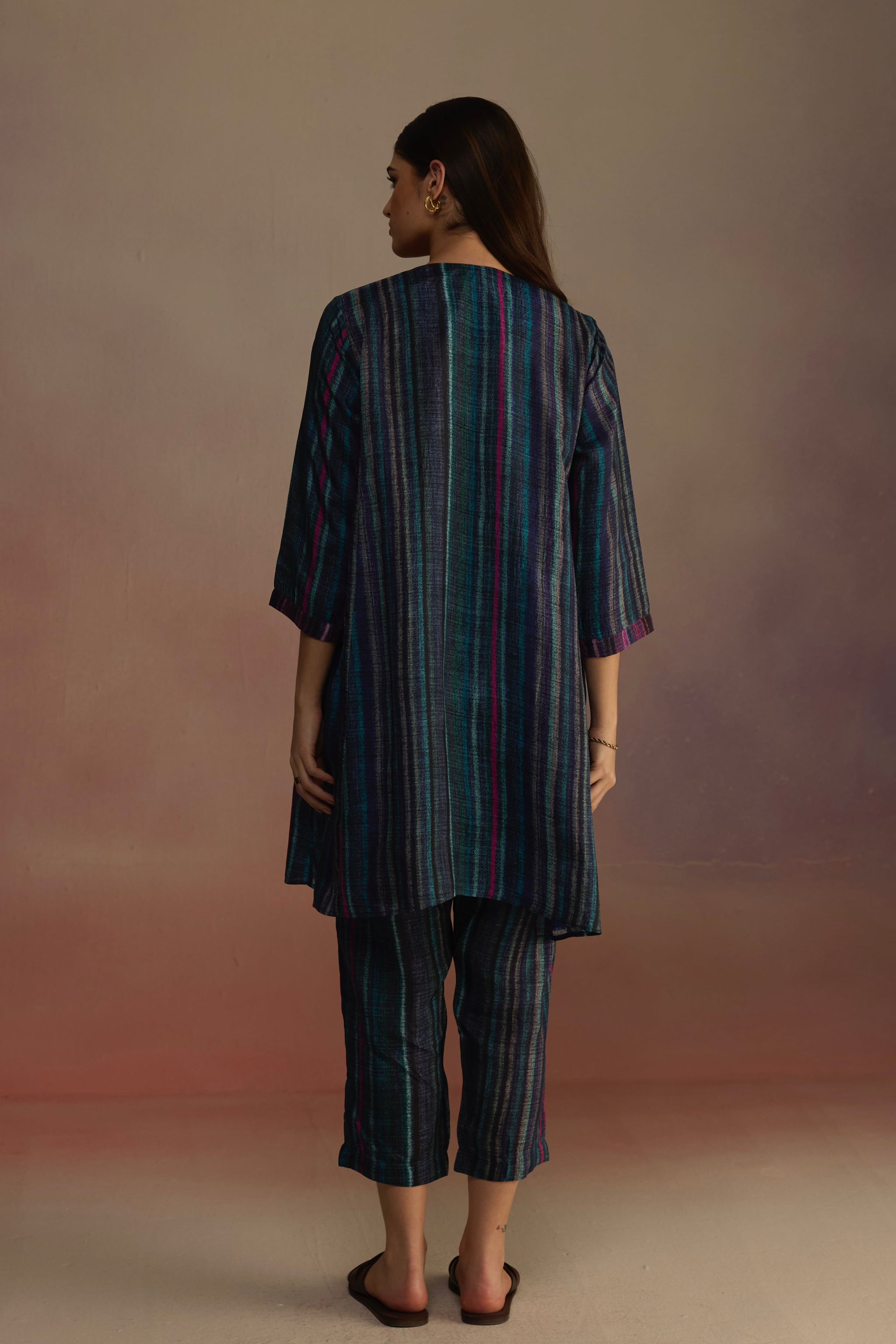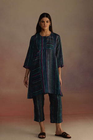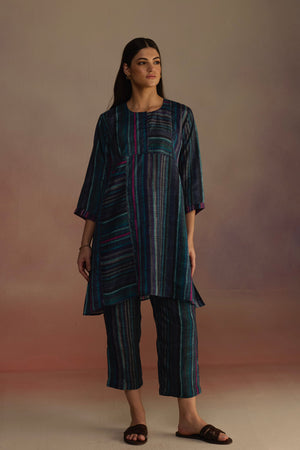 • A short a-line kurta crafted in habutai silk, featuring a hand-sketched stripe print in festive hues. The tunic has glitter trims across the front placket.
