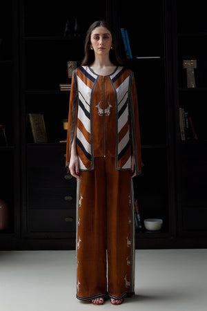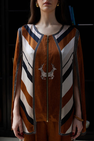 • Ayal’s warm tan canvas meets striking chevron lines, crowned by the graceful deer emblem. Earthy yet refined, it’s a modern ode to grounded elegance.