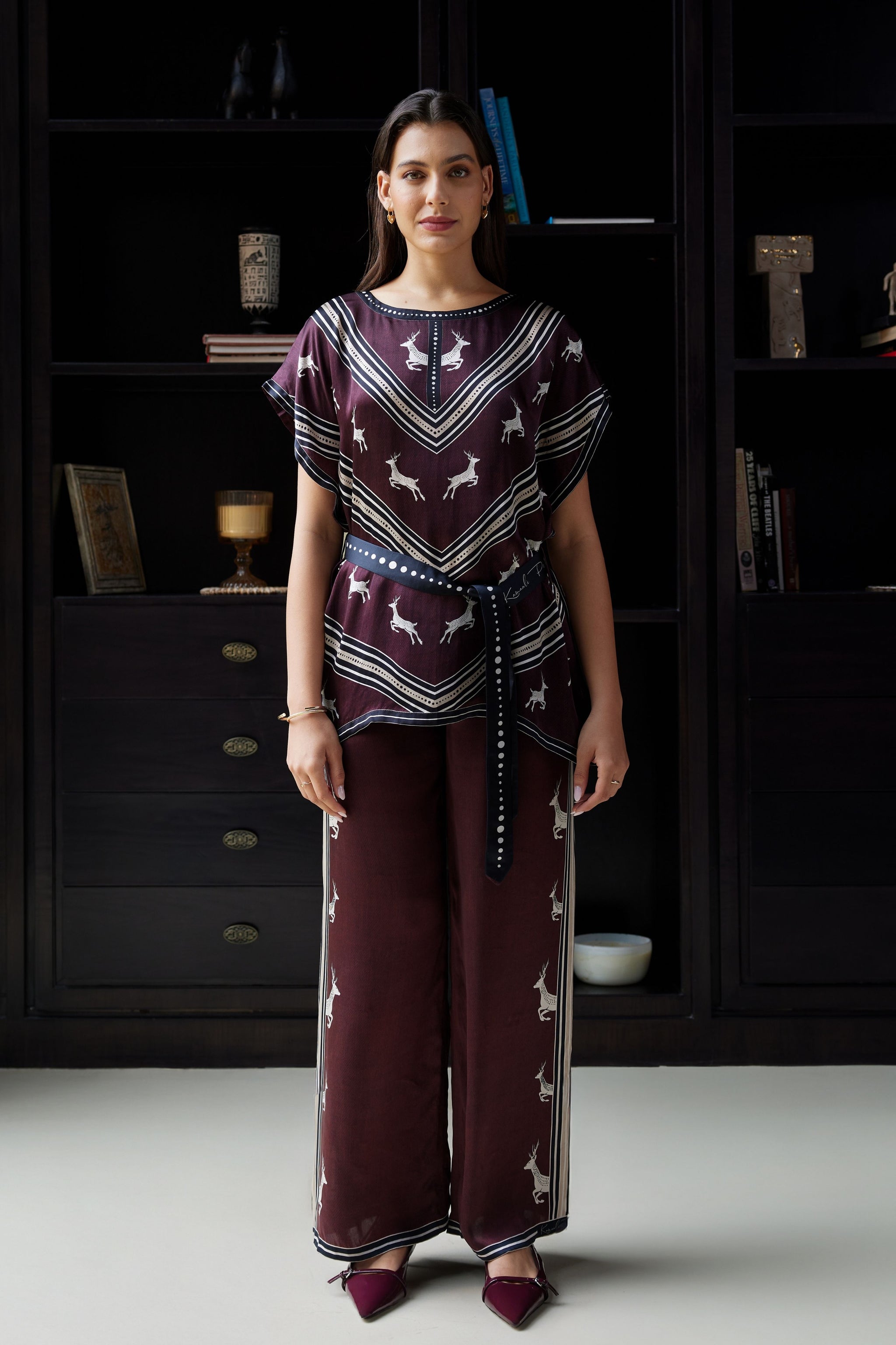• Grace in motion — Ayala’s deep burgundy canvas is adorned with delicate deer motifs, echoing strength wrapped in serenity. The chevron lines frame the silhouette, while the soft belt cinches the waist with quiet elegance.