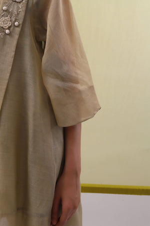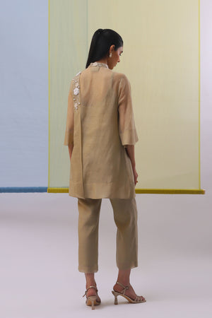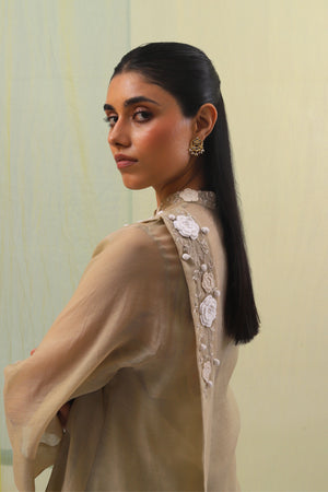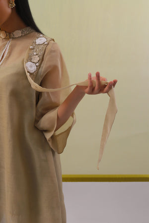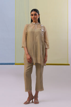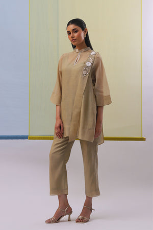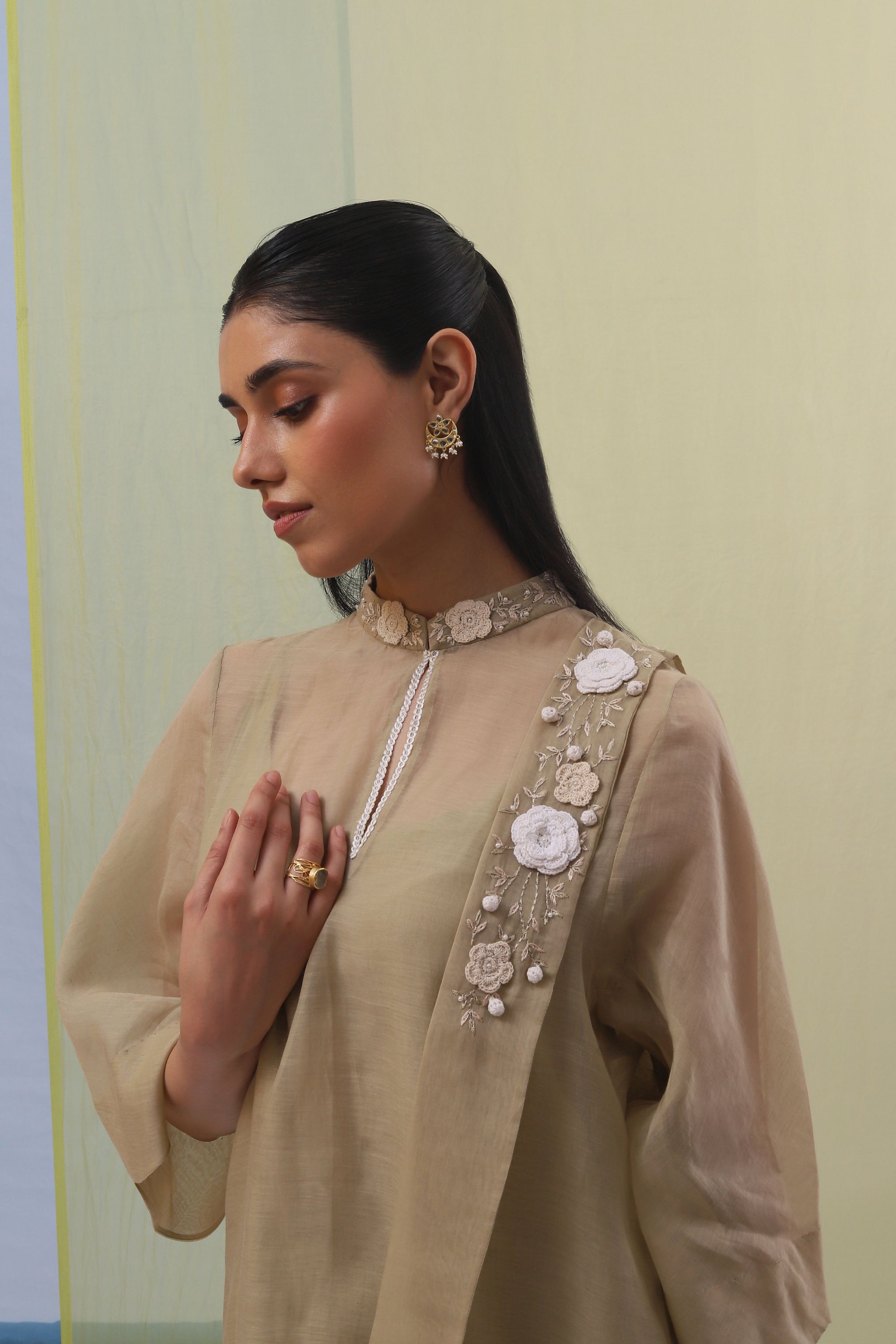 • Step into the spotlight with our elegant beige handwoven chanderi mulmul co-ordinate set. The a-line top boasts of bell sleeves, stand collar, and a long fabric band attached on the left shoulder. It is exquisitely adorned with off-white and beige cotton thread embroidered 3d flowers, making it a masterpiece of grace. Paired with straight-fit pants, this ensemble exudes sophistication, promising to leave a lasting impression at any special occasion.