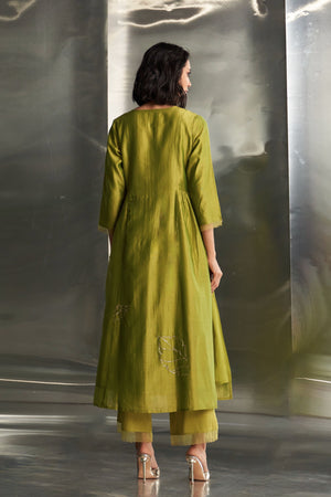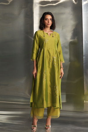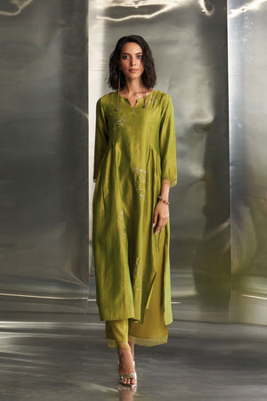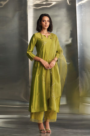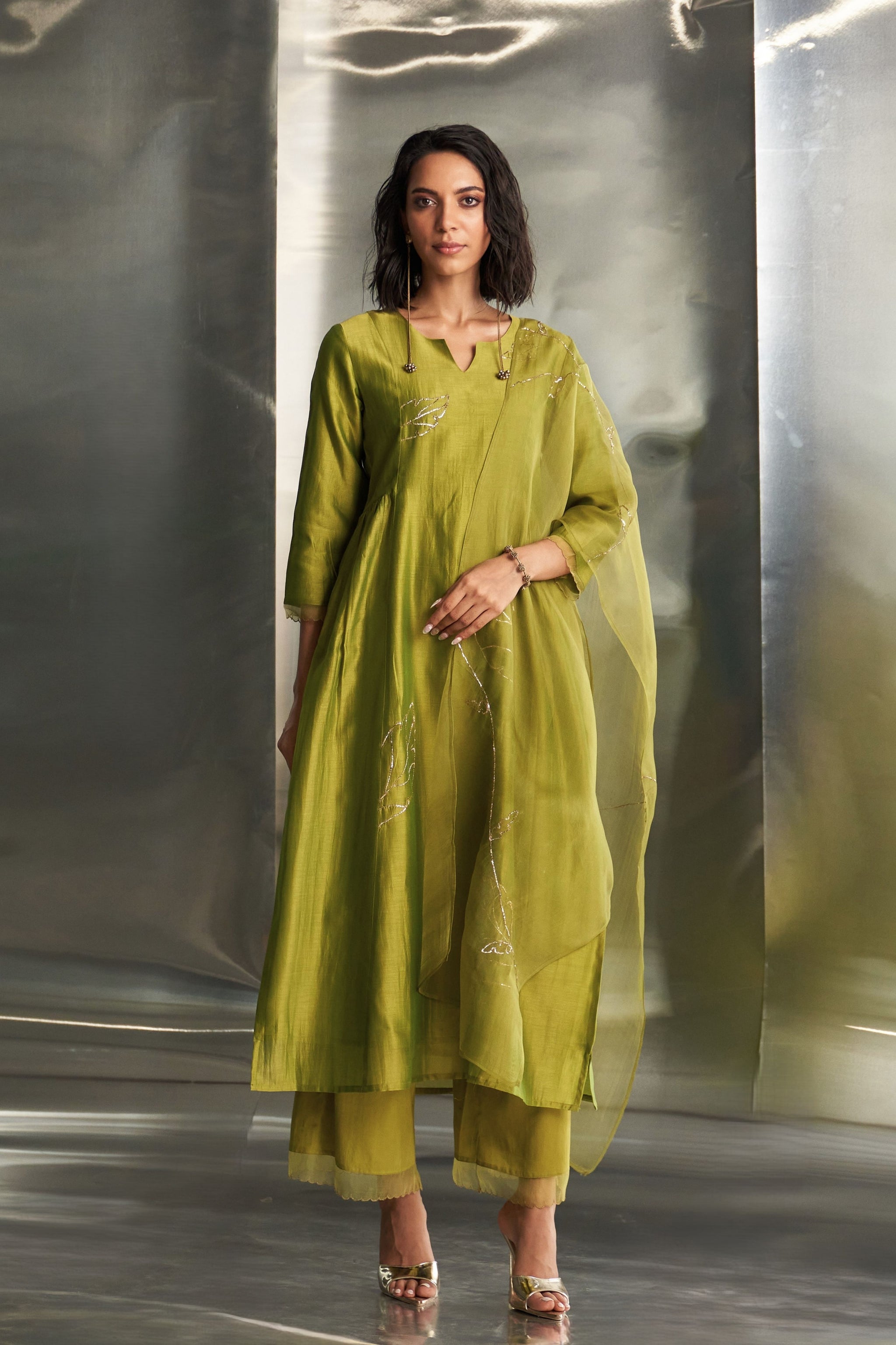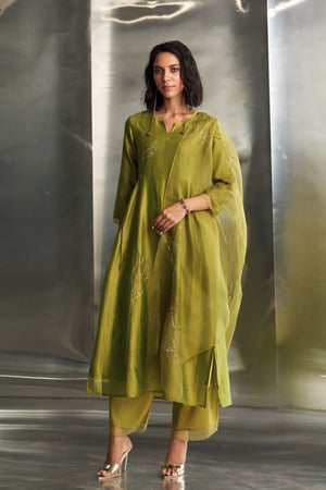 • This berry green chanderi kurta, featuring a light and flowing silhouette with intricate nakshi handwork, is a timeless piece. The ensemble is elevated by a dreamy pure organza dupatta adorned with nakshi handwork and a flowy bottom with scalloped edges, adding a glamorous touch to the overall look.