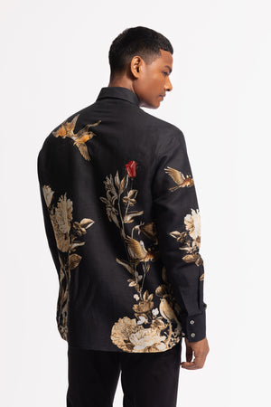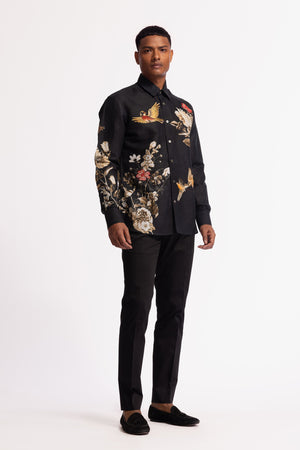 • This refined black shirt is crafted from premium poplin fabric and features a captivating floral print intertwined with a delicate bird motif. A fusion of elegance and craftsmanship, the design is enhanced with a mix of intricate hand and machine embroidery. A signature piece from the house of rohit bal, perfect for those who appreciate artistry in modern menswear.