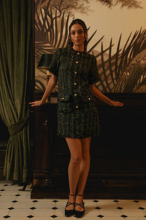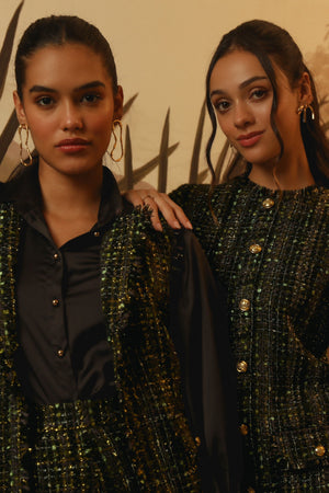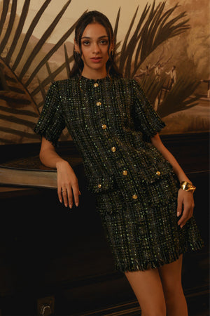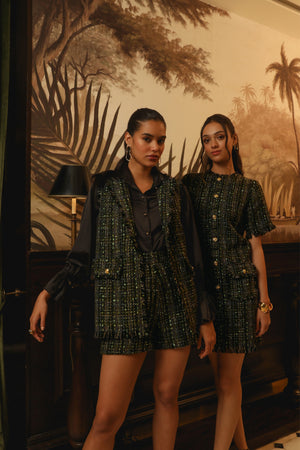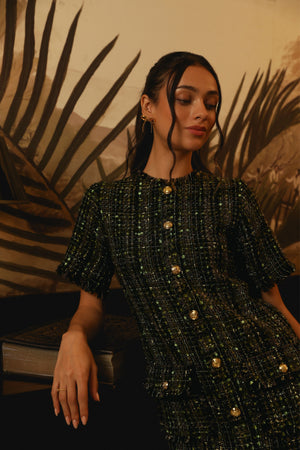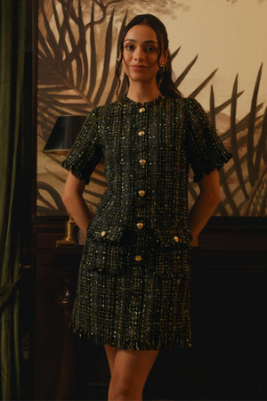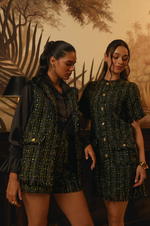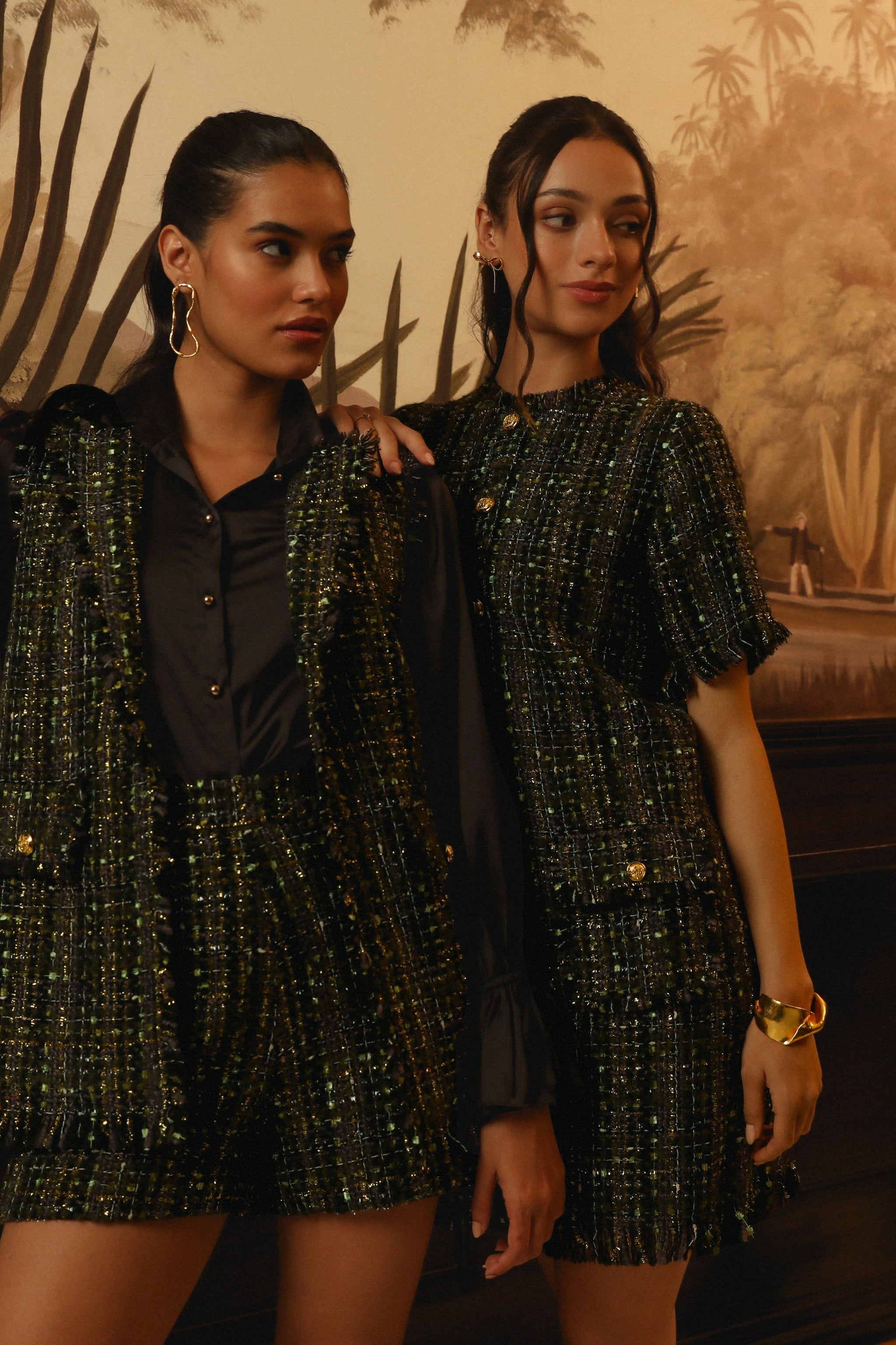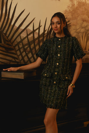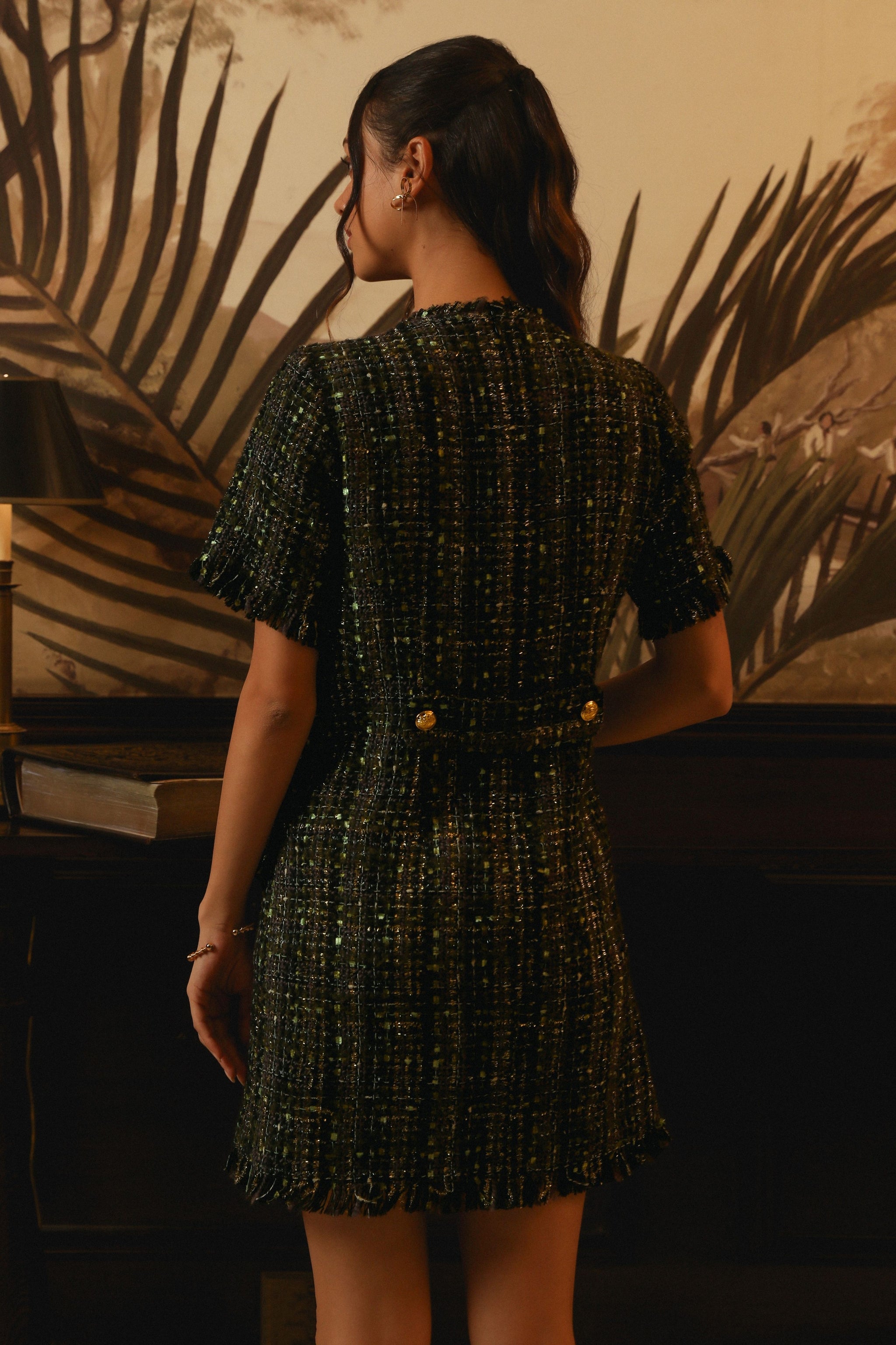 • Dress straight fit tweed dress faux placket half sleeves with fringe opening fringe & pocket detail on the body gold metallic buttons back zipper closure with button-tab