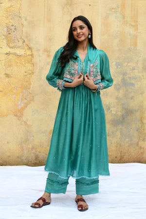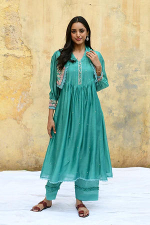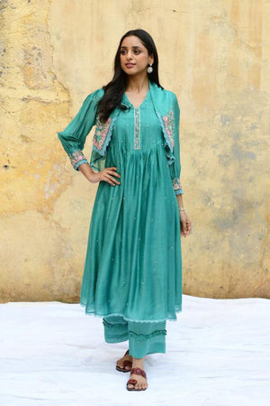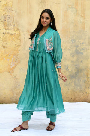 • This kurta set comes with an attached, short chic jacket with a profusion of bullion and lachha flowers, highlighted with pearls, beads and 3d organza buds. The cuff of the sleeves has the similar embroidery details with broad pleats on the yoke and an embroidered patti. The kurta also has a sprinkle of french knot geethas. Pant comes with pleating and frill details. Embroidered organza dupatta available on request.