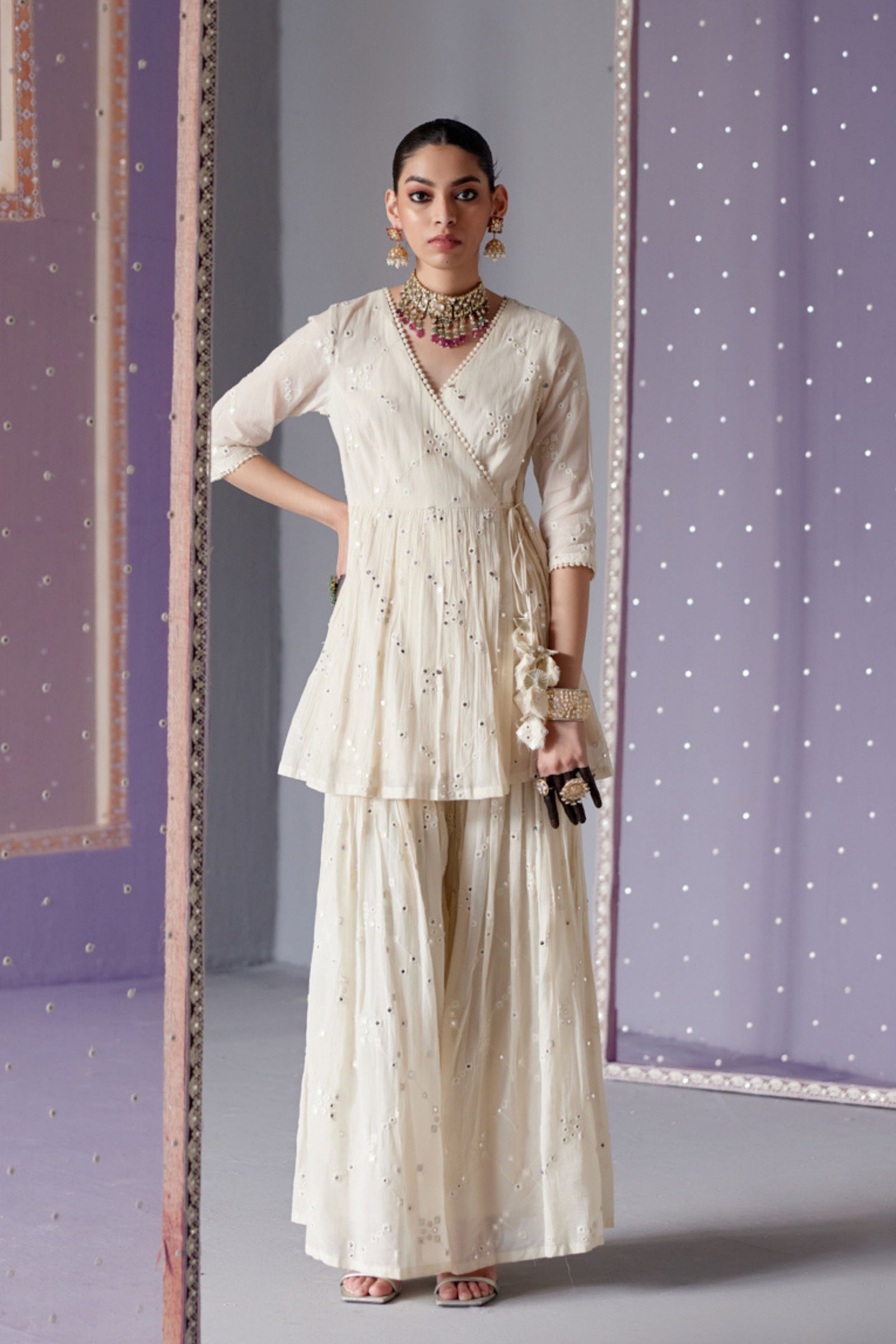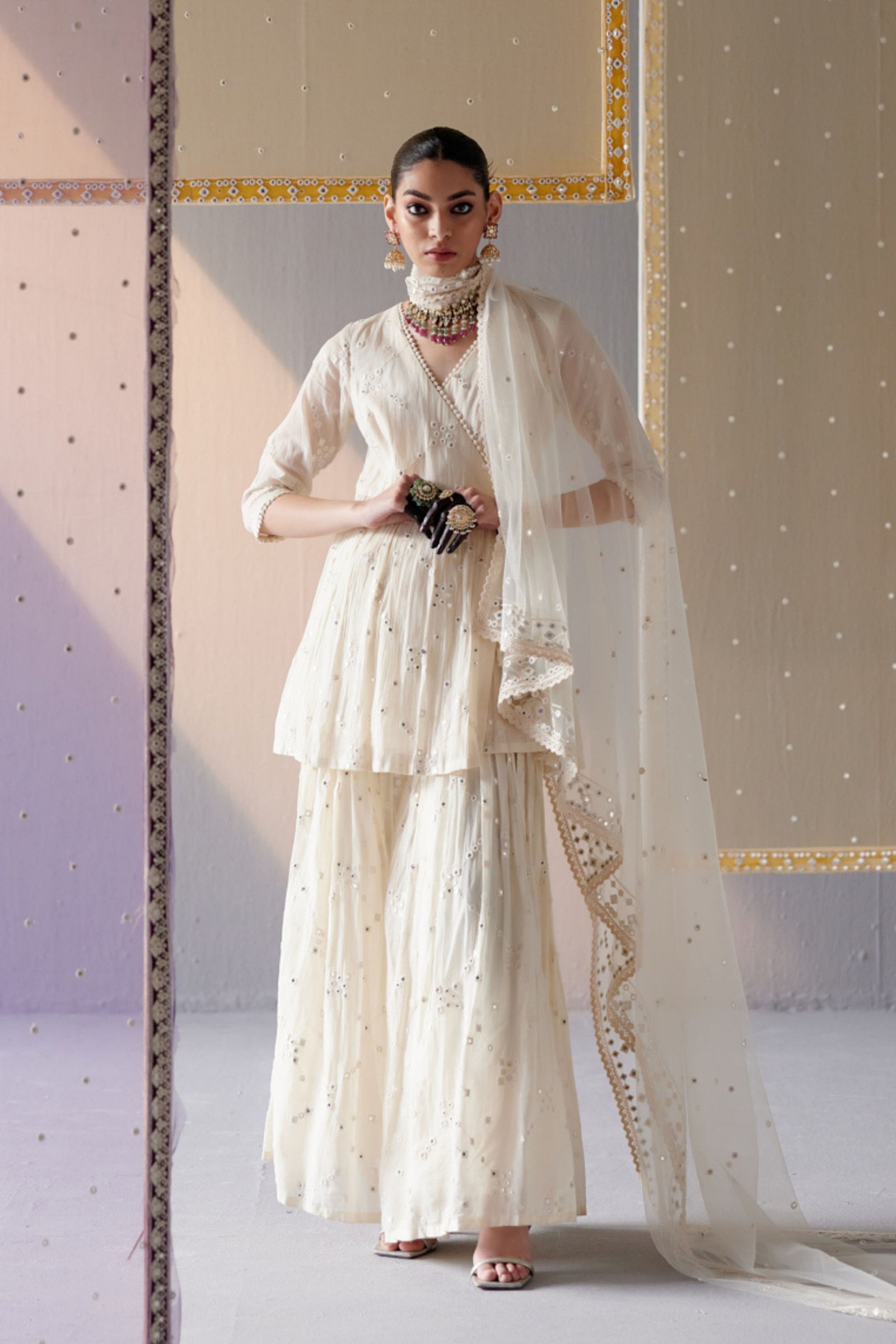 • Blush pink ambi angrakha with embroidered dupatta
