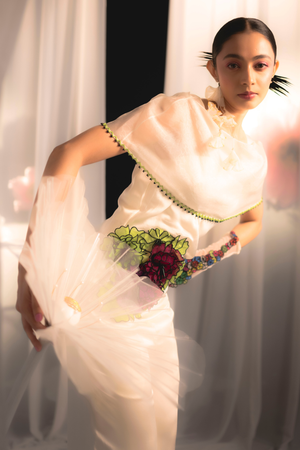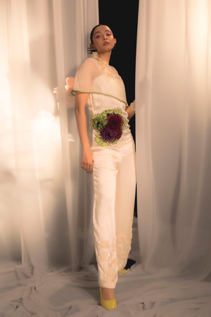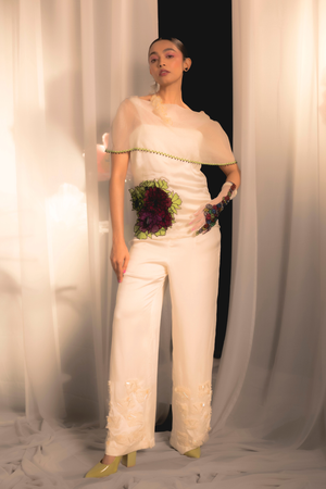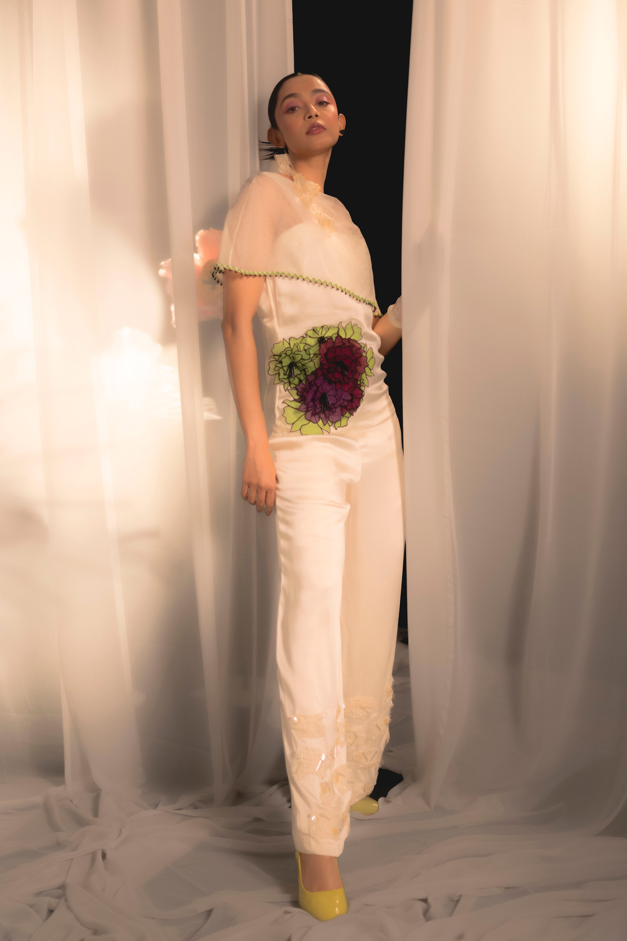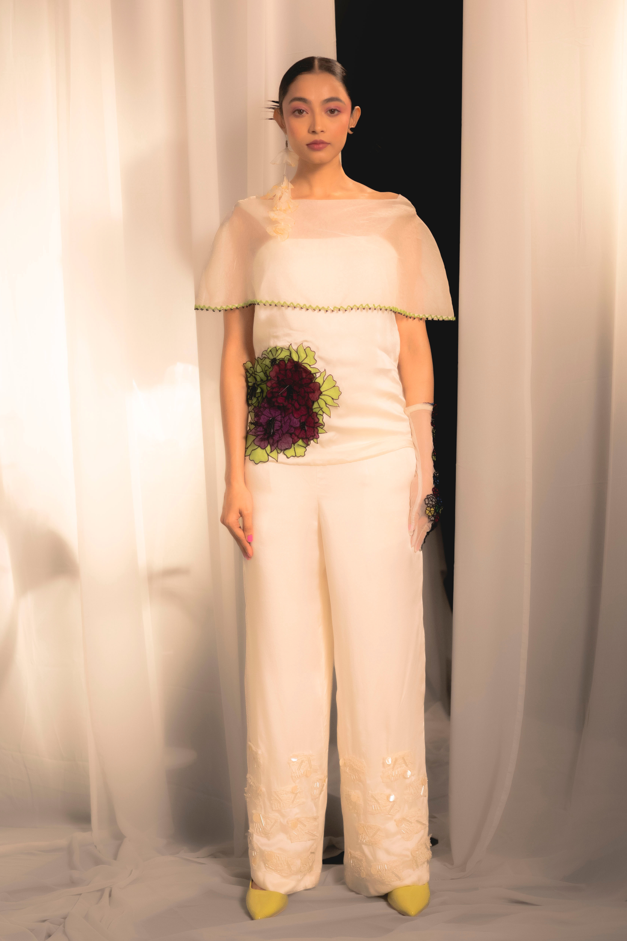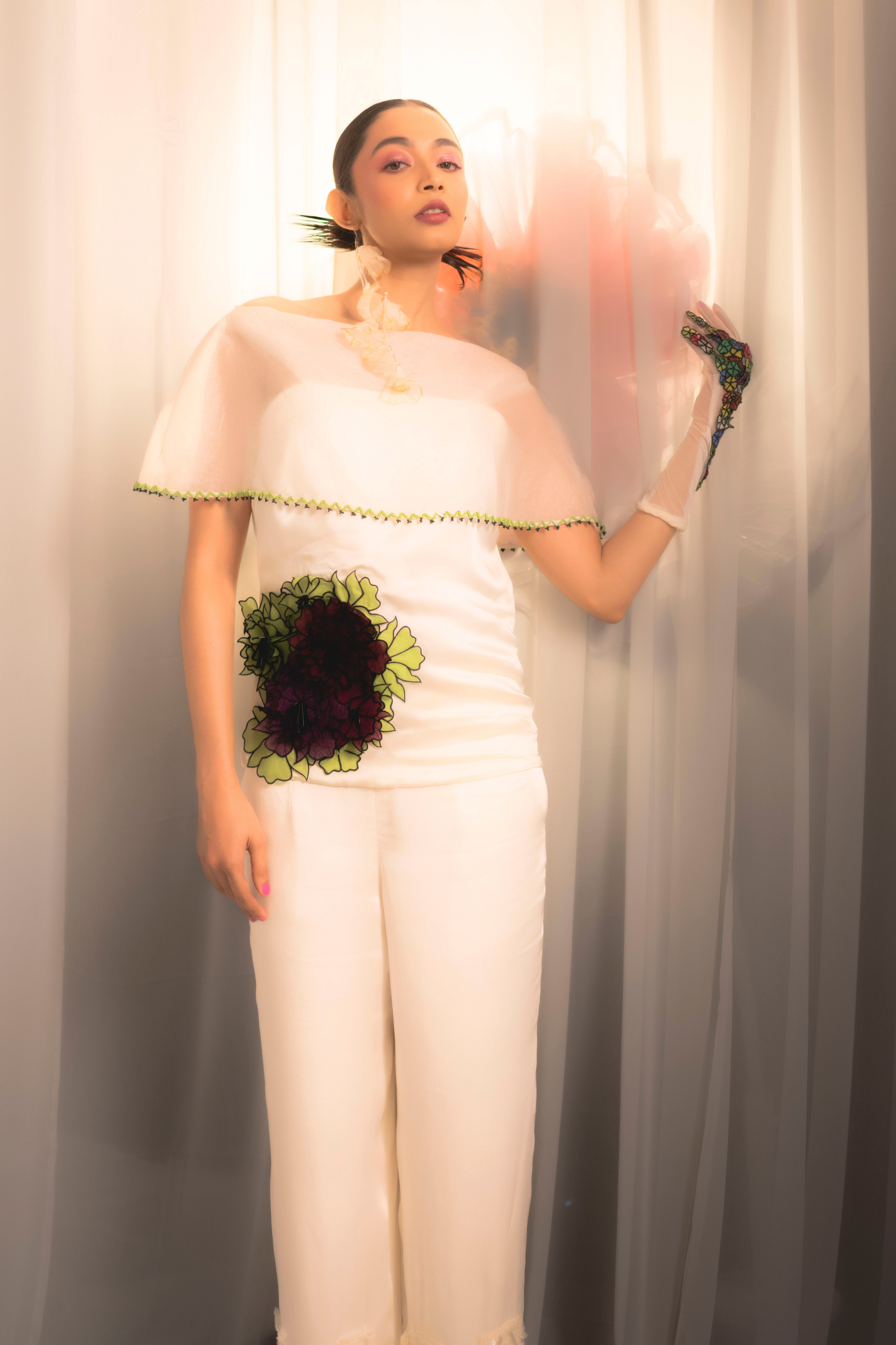 • Turn heads with this satin tube top, with a flowing organza cape for an effortlessly dramatic touch. Adorned with bold 3d florals in striking shades of red, green, and purple, each bloom is strategically placed to create a captivating statement. Whether styled with sleek white pants or an elegant skirt, this look is the epitome of luxurious sophistication— perfect for a refined yet bold day ensemble