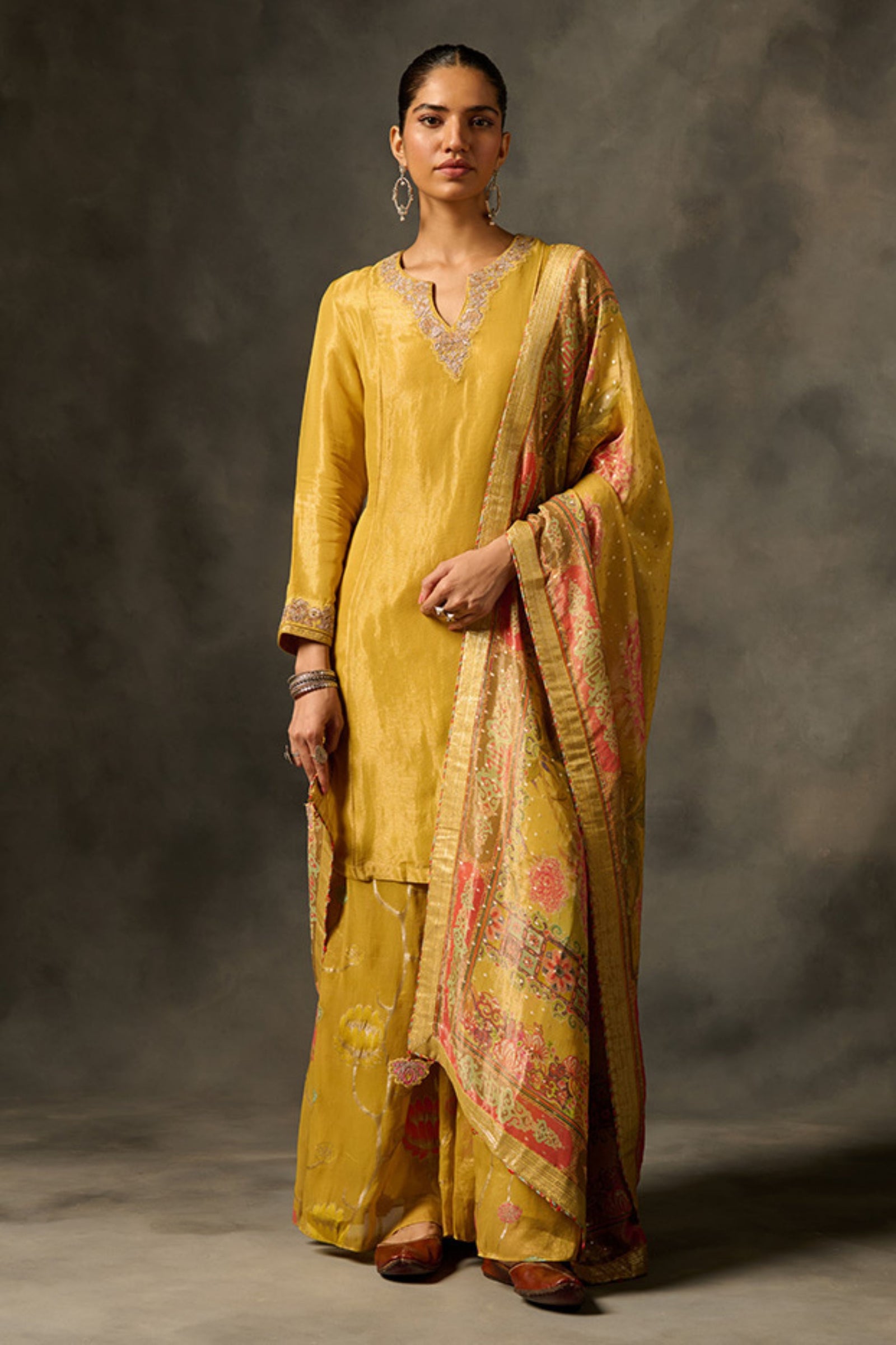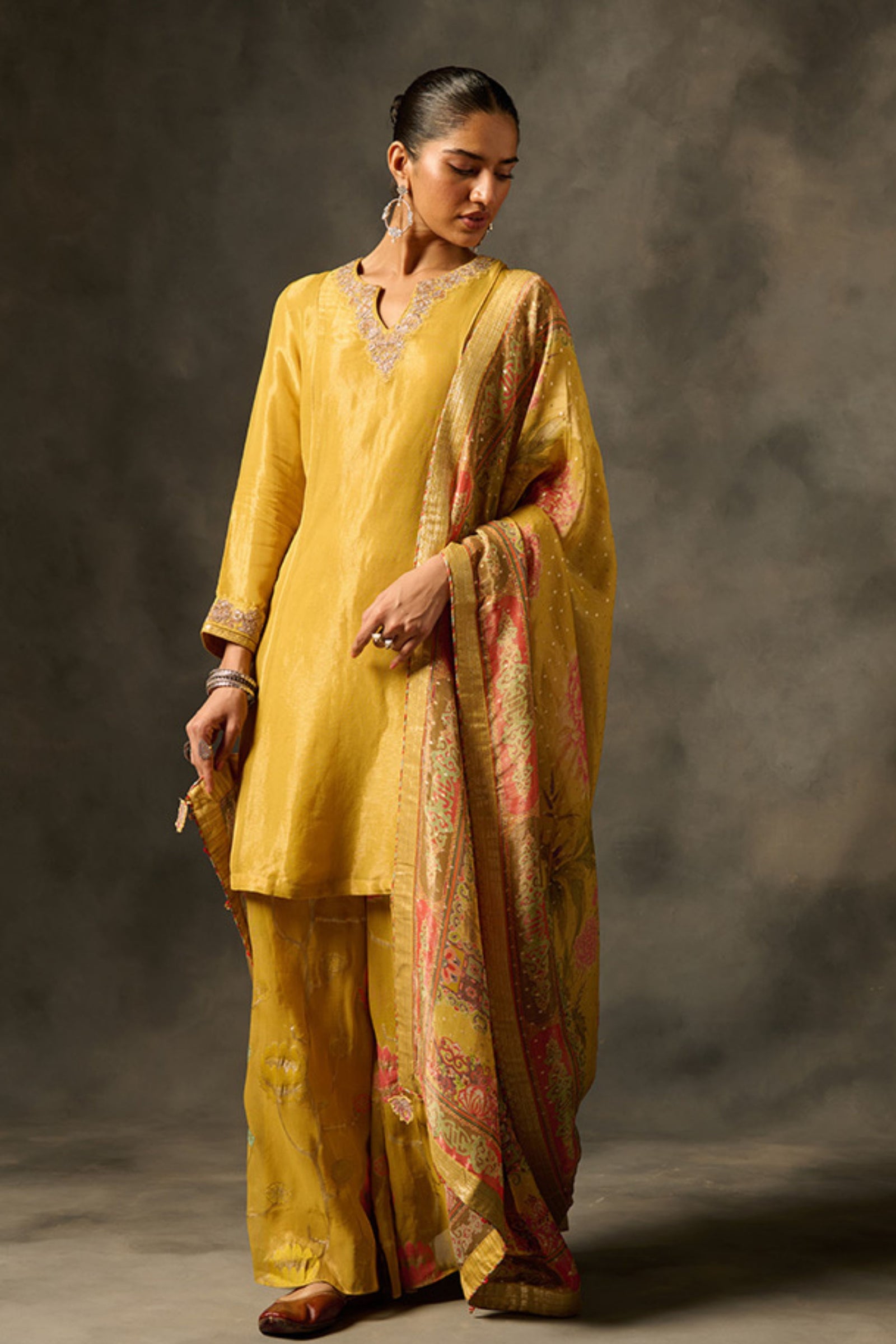• Chahat is crafted from 100% cotton for the softest wear & feel. In Ochre yellow the kurta features a striking one-sided printed placket with statement printed sleeve cuffs and hidden side-seam pockets. Paired with printed pants, perfect for occasions or easy days out