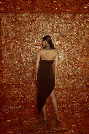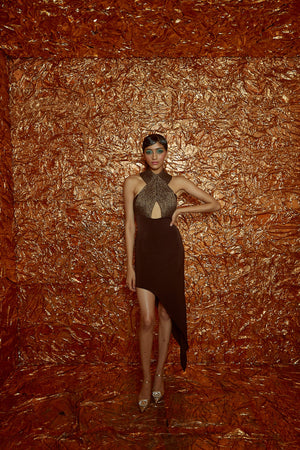 • Chocolate brown micro dress with halter-neck corded and asymetrical hemline