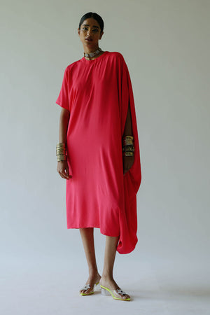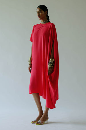 • Claire pink dress. Round neck, back zip closure and detailed with one side half sleeves and one side extended shoulder with slit-hole, asymmetric hemline. Dress length - 46".