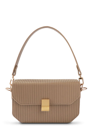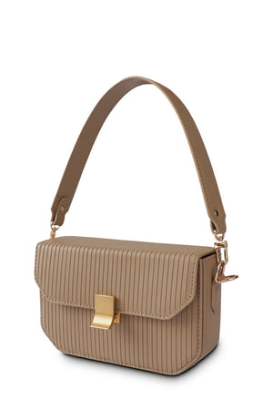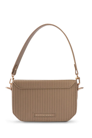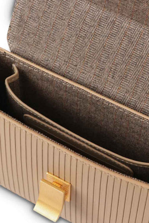 • The harlow shoulder bag is handcrafted with genuine leather. It comes equipped with a d-ring, offering size variation for the strap and a metal lock. Its interior is lined with herringbone and consists of a card case.
