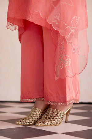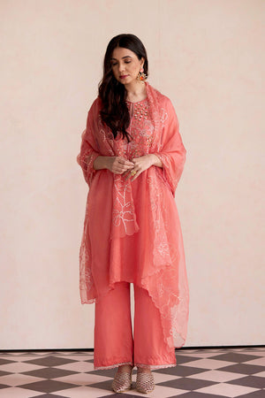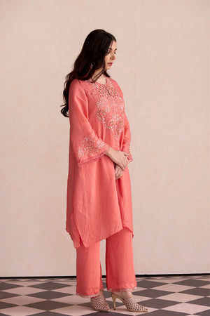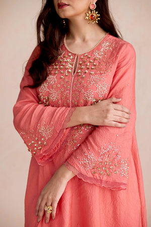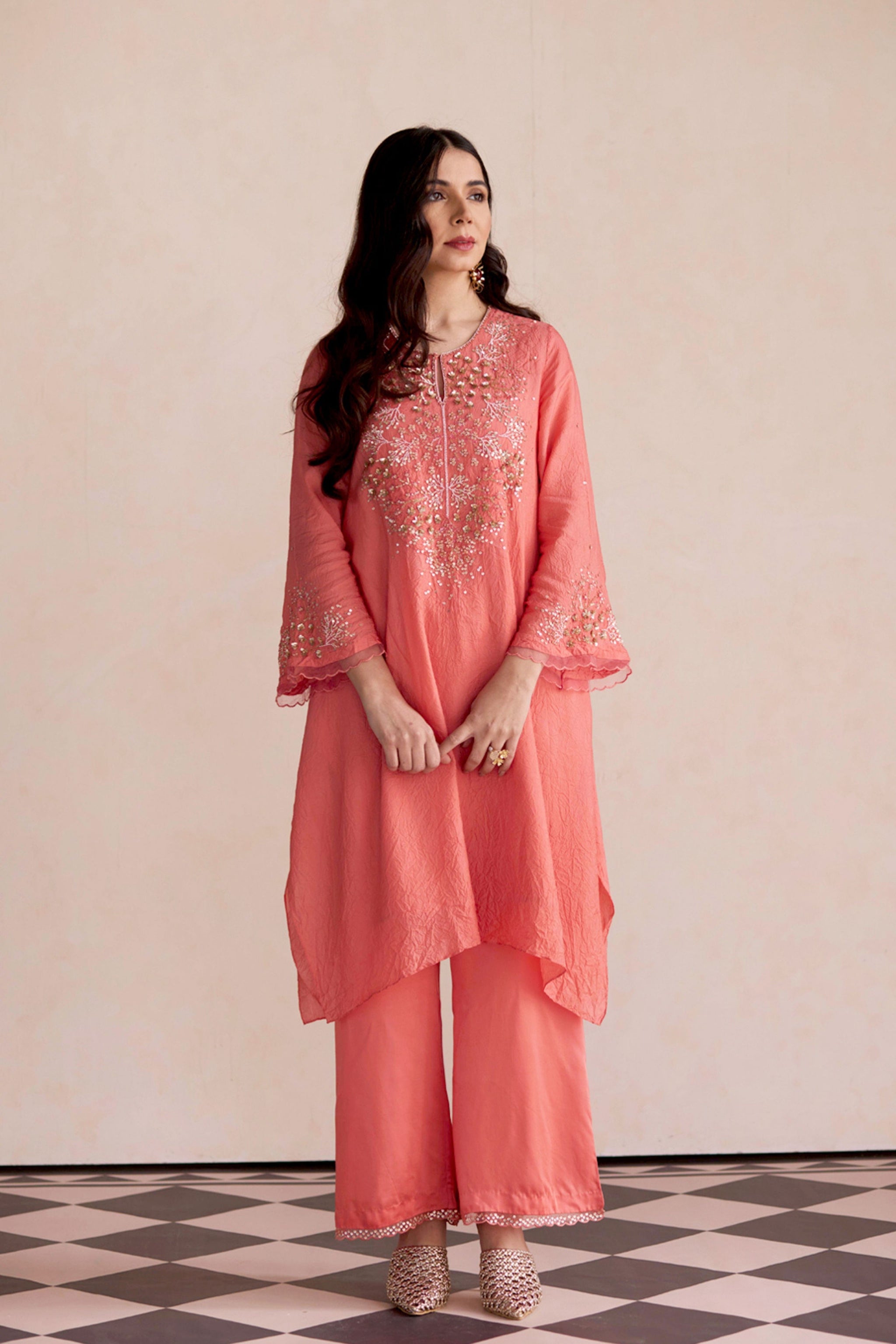 • Featuring a coral asymmetric kurta set in viscose silk base with intricate sequins and crystal embroidery on yoke and sleeves