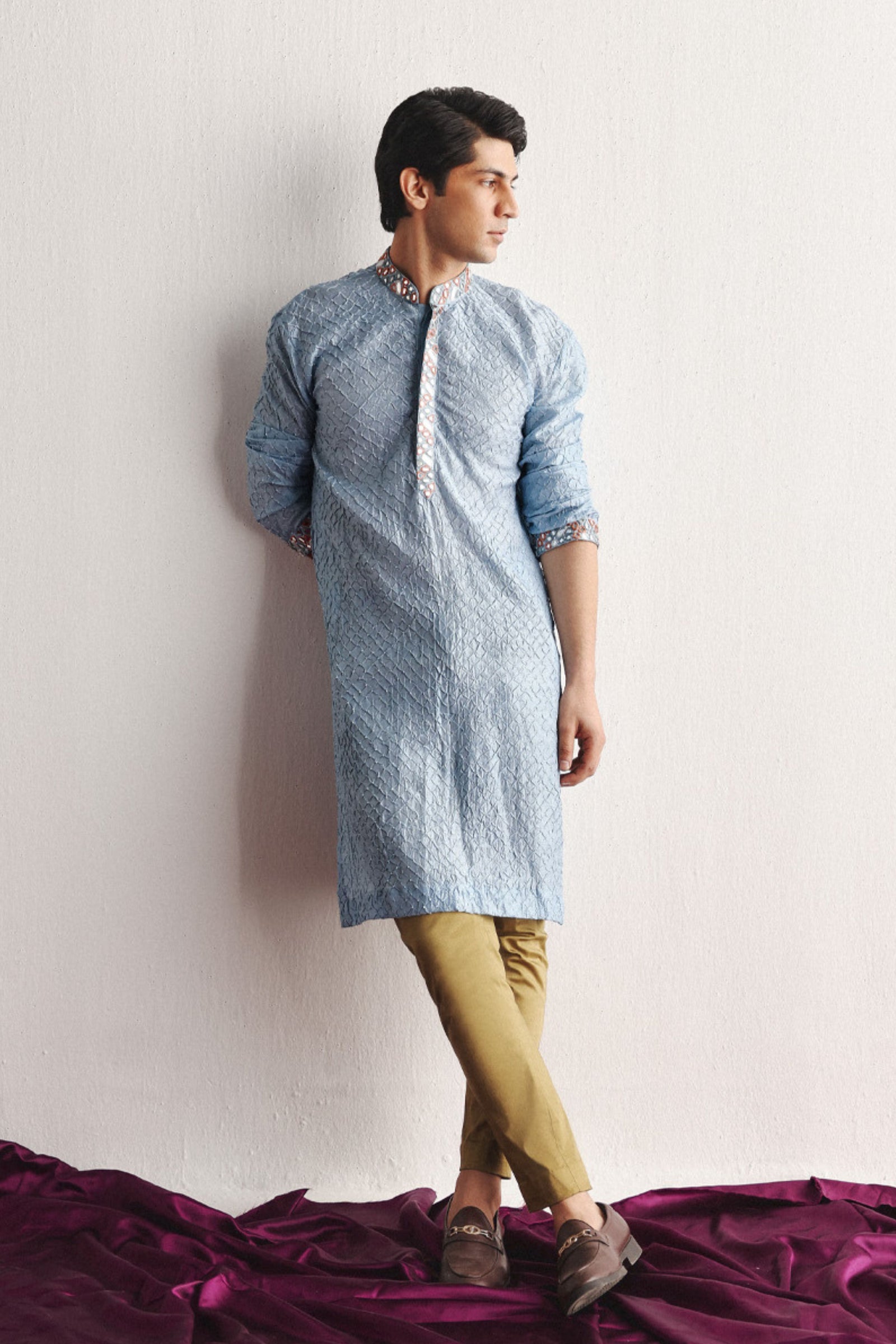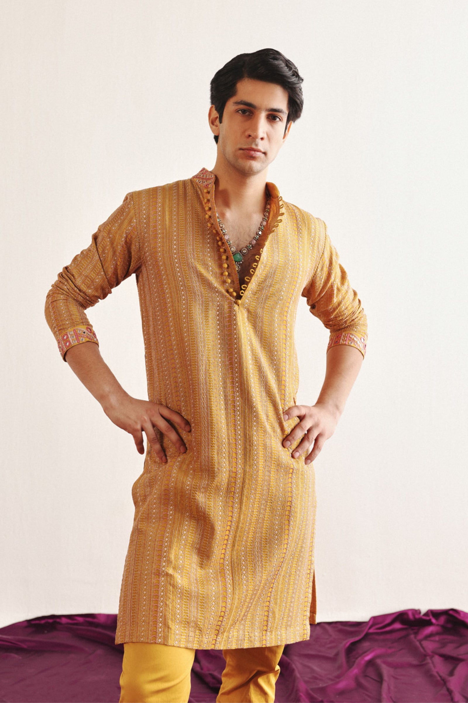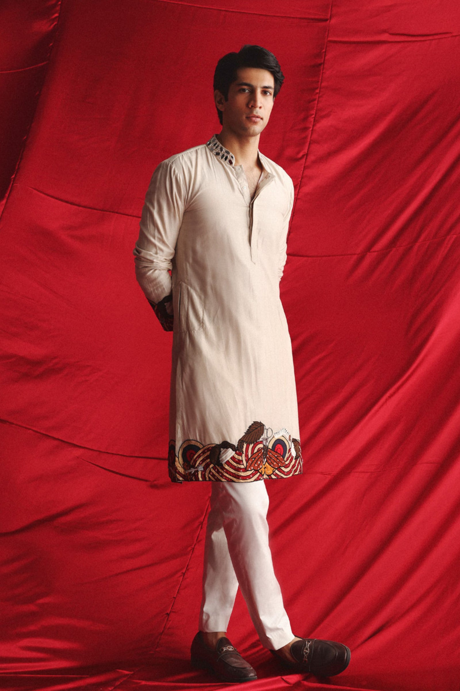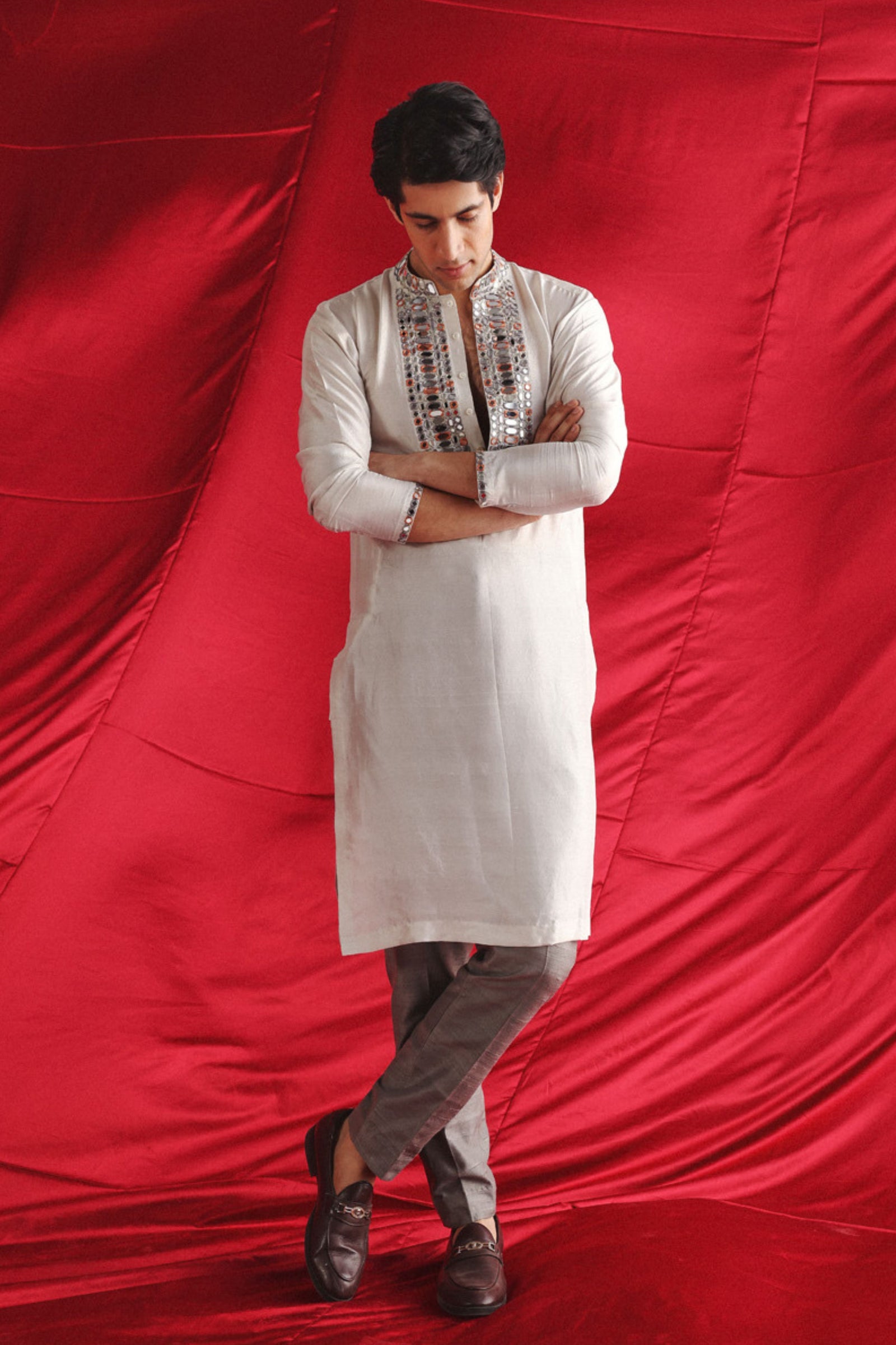 • This cotton silk kurta is specially designed by our team embellished with a mirrorwork & beadwork effect and is crafted with great care and precision. The garment is then styled at our studio with finest details.