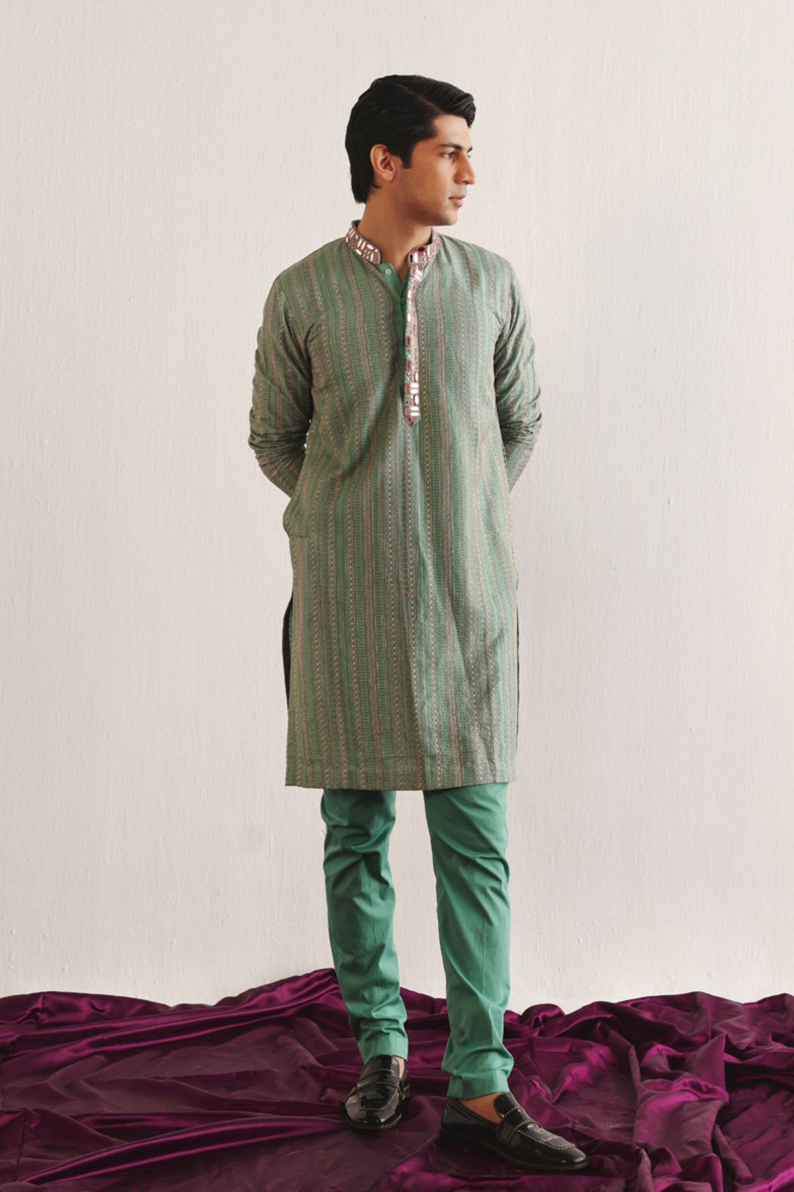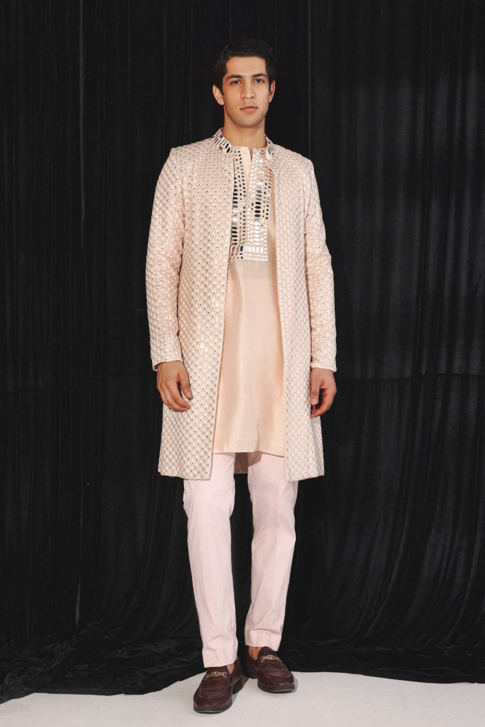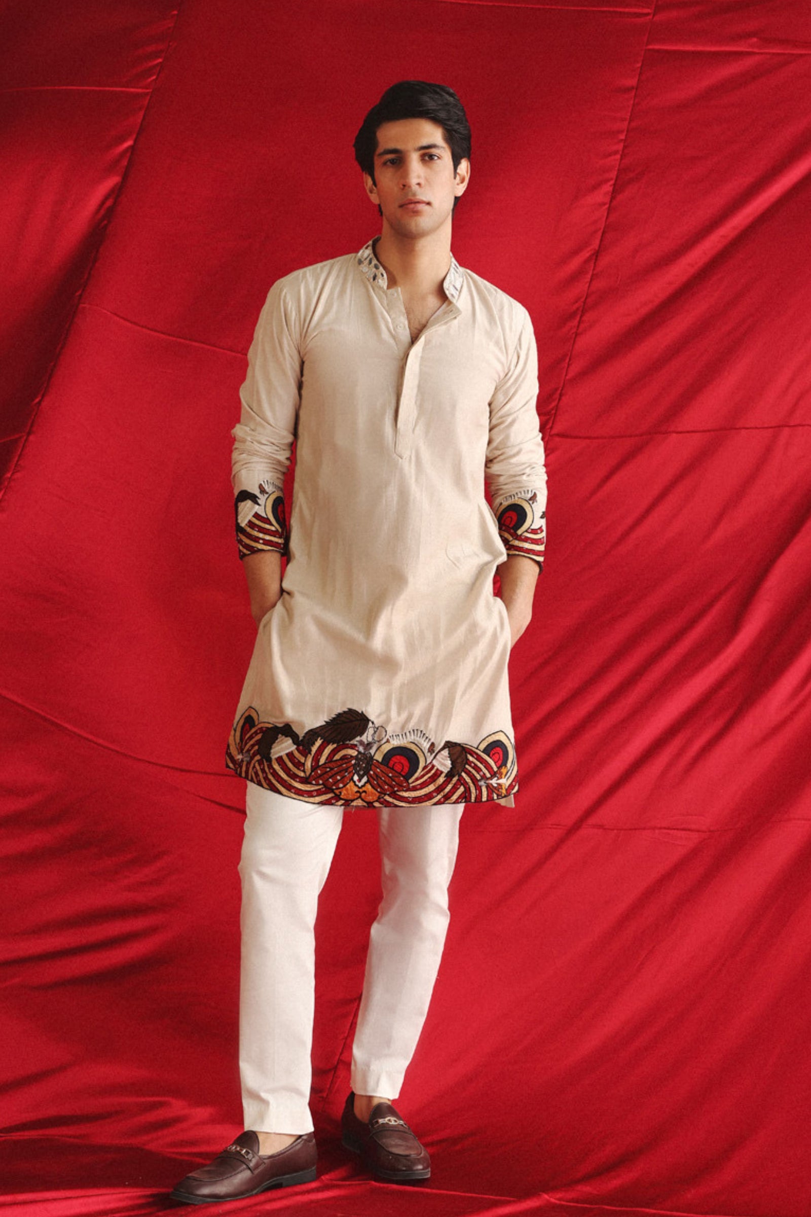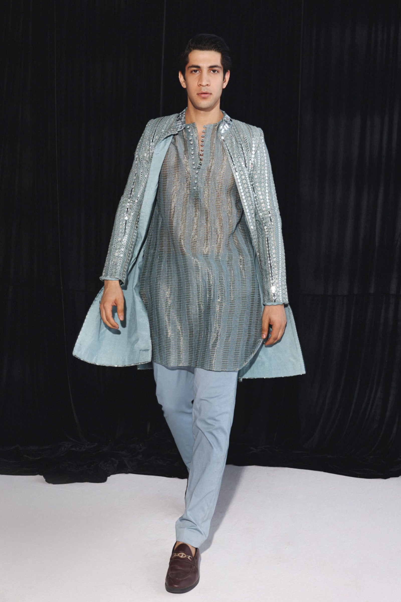 • This cotton silk kurta is specially designed by our team embellished with a mirrorwork & beadwork effect and is crafted with great care and precision. The garment is then styled at our studio with finest details.