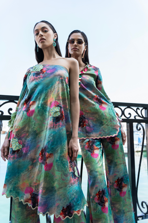 • One shoulder draped kaftan set with 3d coral tassels and flared pant