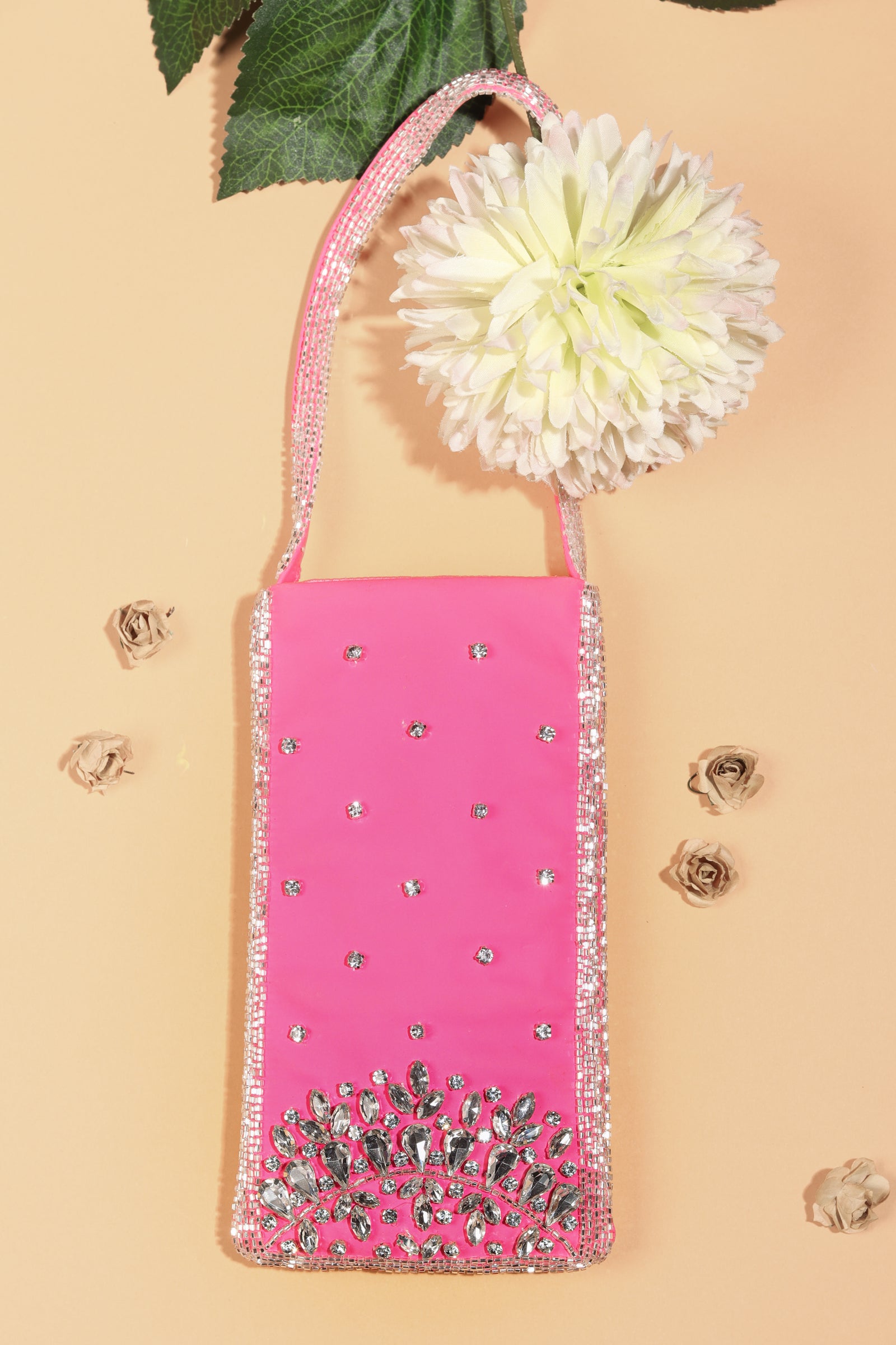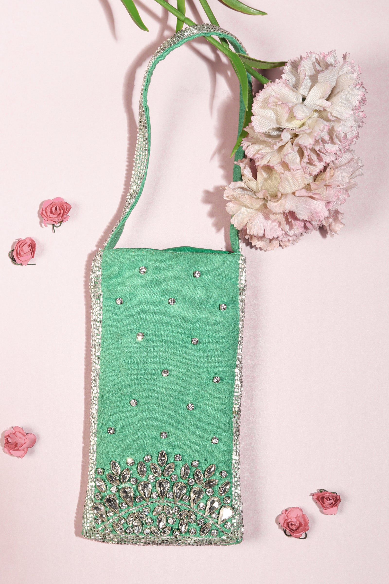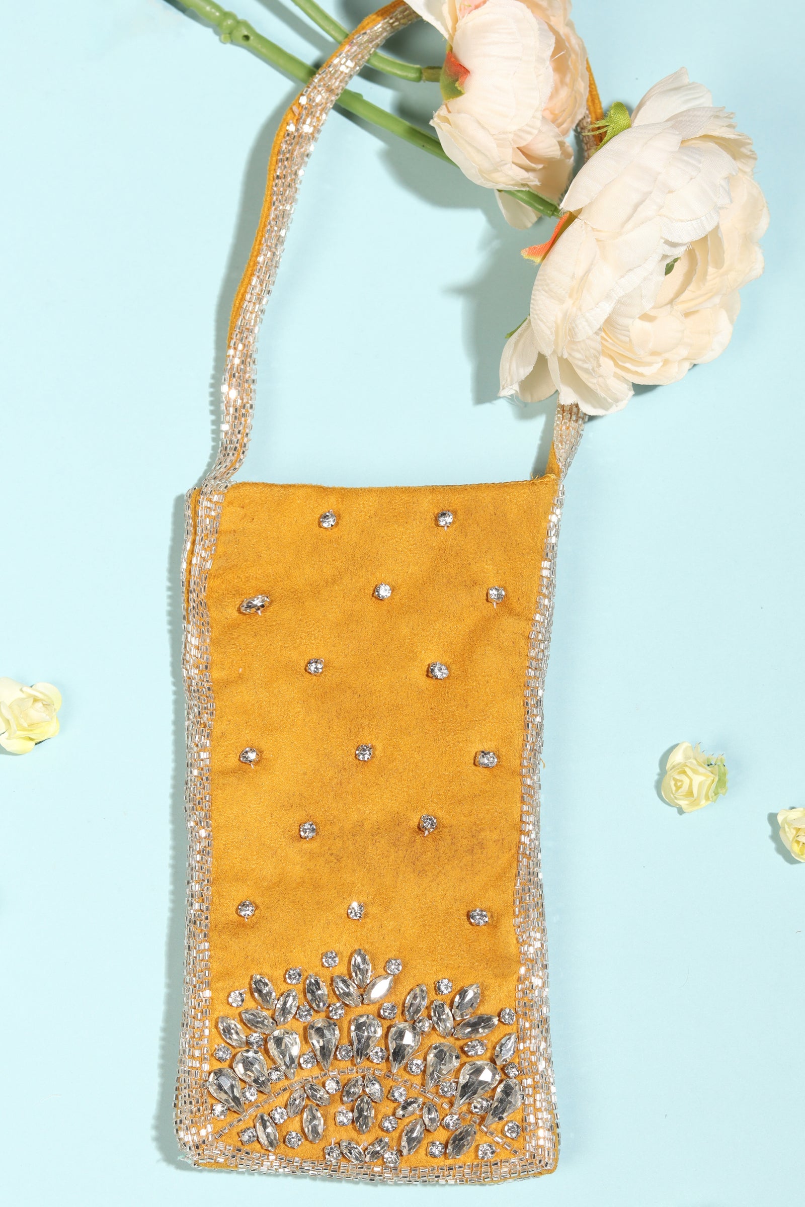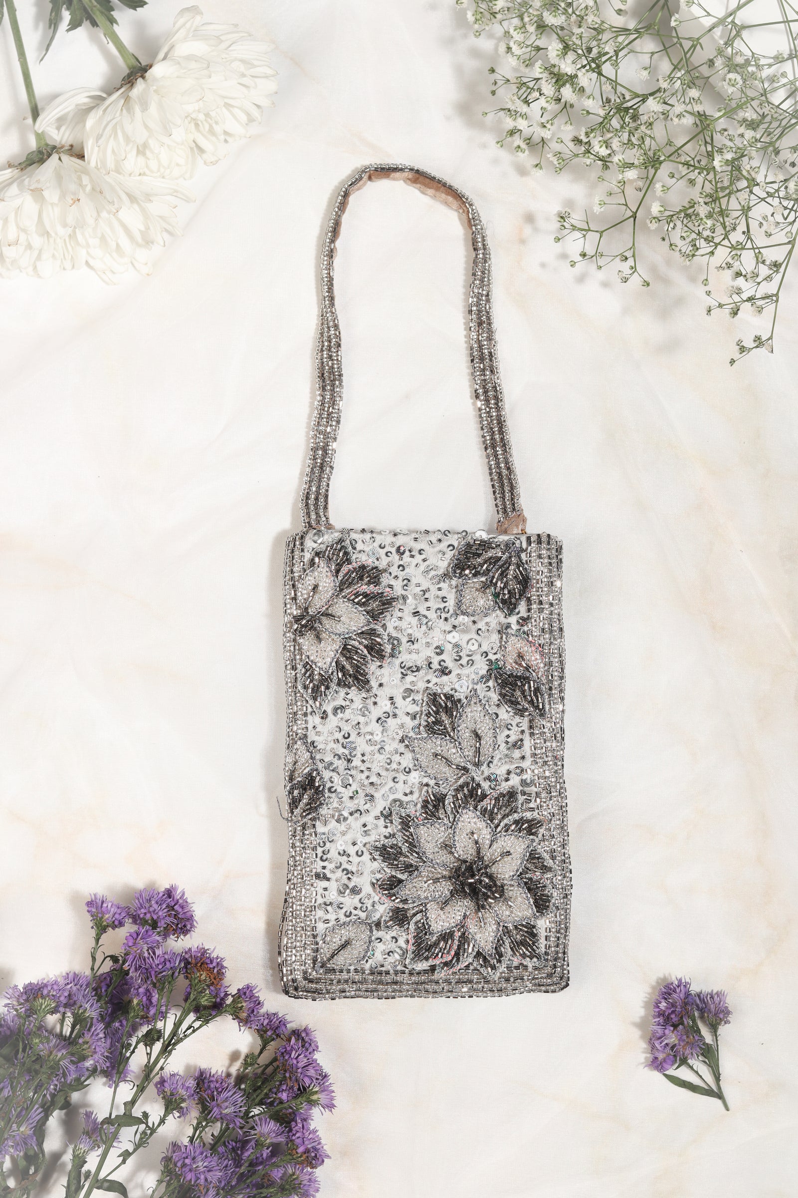 • This potli bag is crafted from Banarasi fabric and embellished with pitta and sequin work in silver and Champagne gold colors. The potlis come adorned with beautifully handcrafted flower tassels. Measuring 24cm in length and 23cm in width.