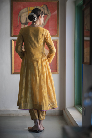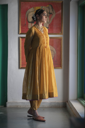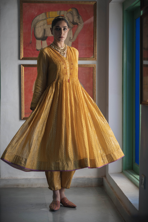 • Hand woven chanderi 40gm pintuck kurta with hanblock printed gold foil and beadwork done by hand. Comes with a 100% cotton slip.