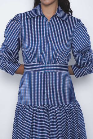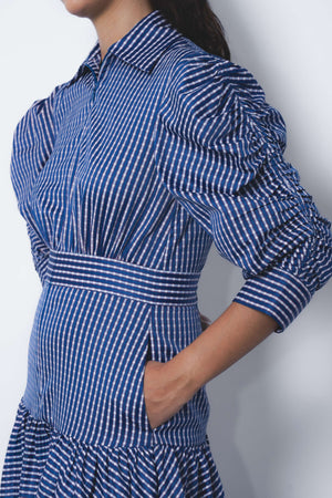 • A classic feminine silhouette, cinched at the waist and defined by voluminous pleated sleeves, is reimagined with a modern twist through a concealed front zipper opening.