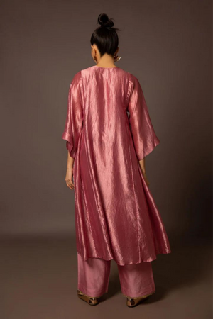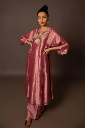 • Hand dyed dupion silk kurta with pitta handwork at neck and side panels with pants.