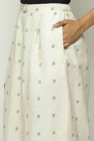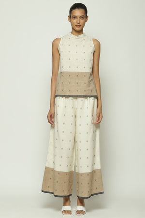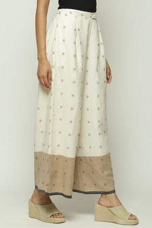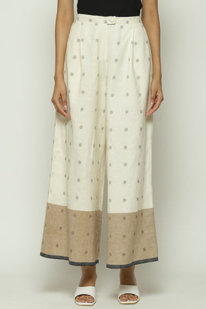 • An ivory pair of palazzo pants with ecru borders, punctuated by full stops. The patterns on this creation are woven into the cotton itself using the jamdani technique.