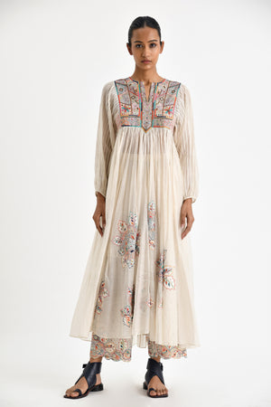 • Relaxed fit pants scalloped with intricately embroidered applique flowers. The motifs are adorned with sequin details. Style it with any of our khadi tunics and get occassion ready.