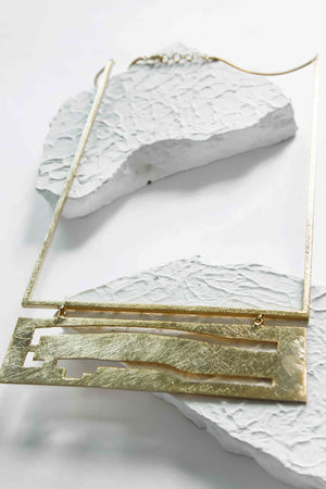 • A gold plated statement abstarct necklace handcrafted in brass. Chain length 23 cm, width 12.9 Cm.