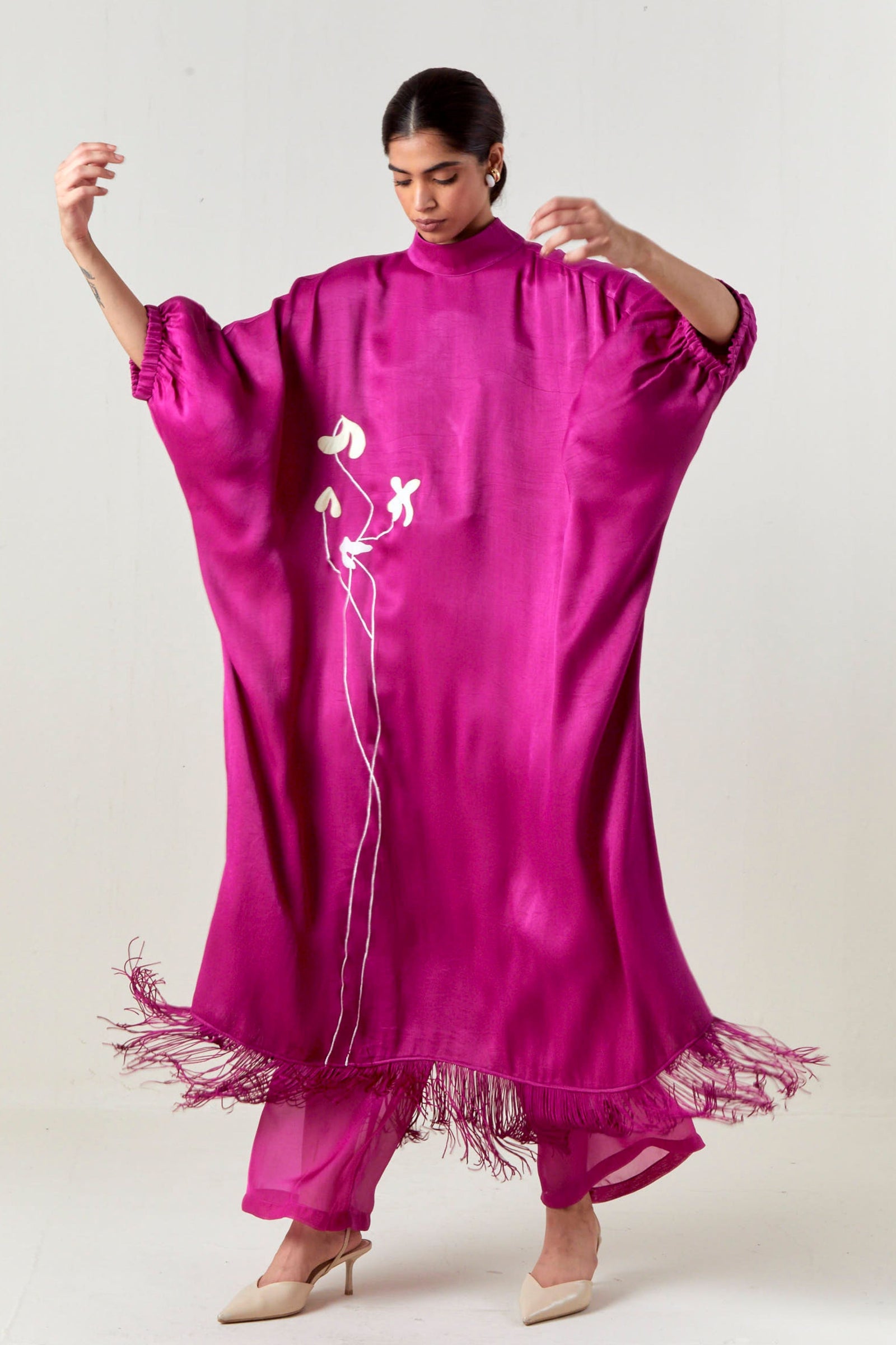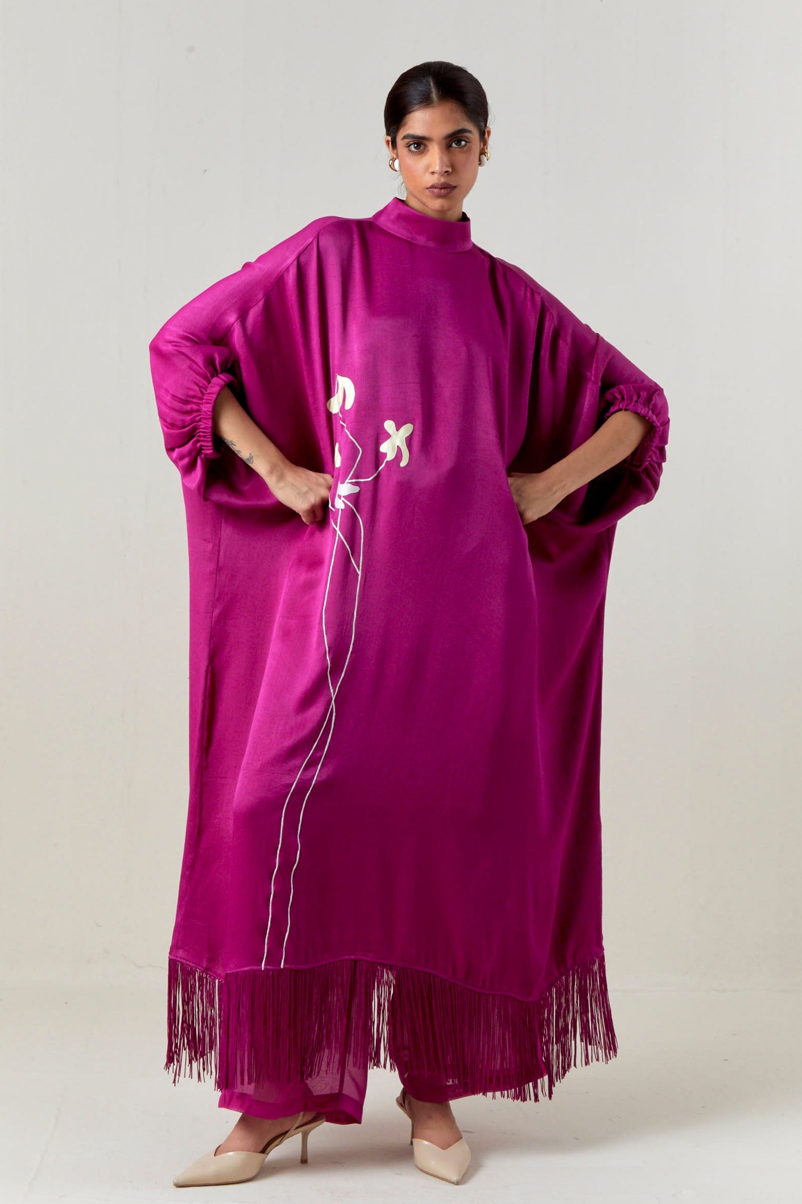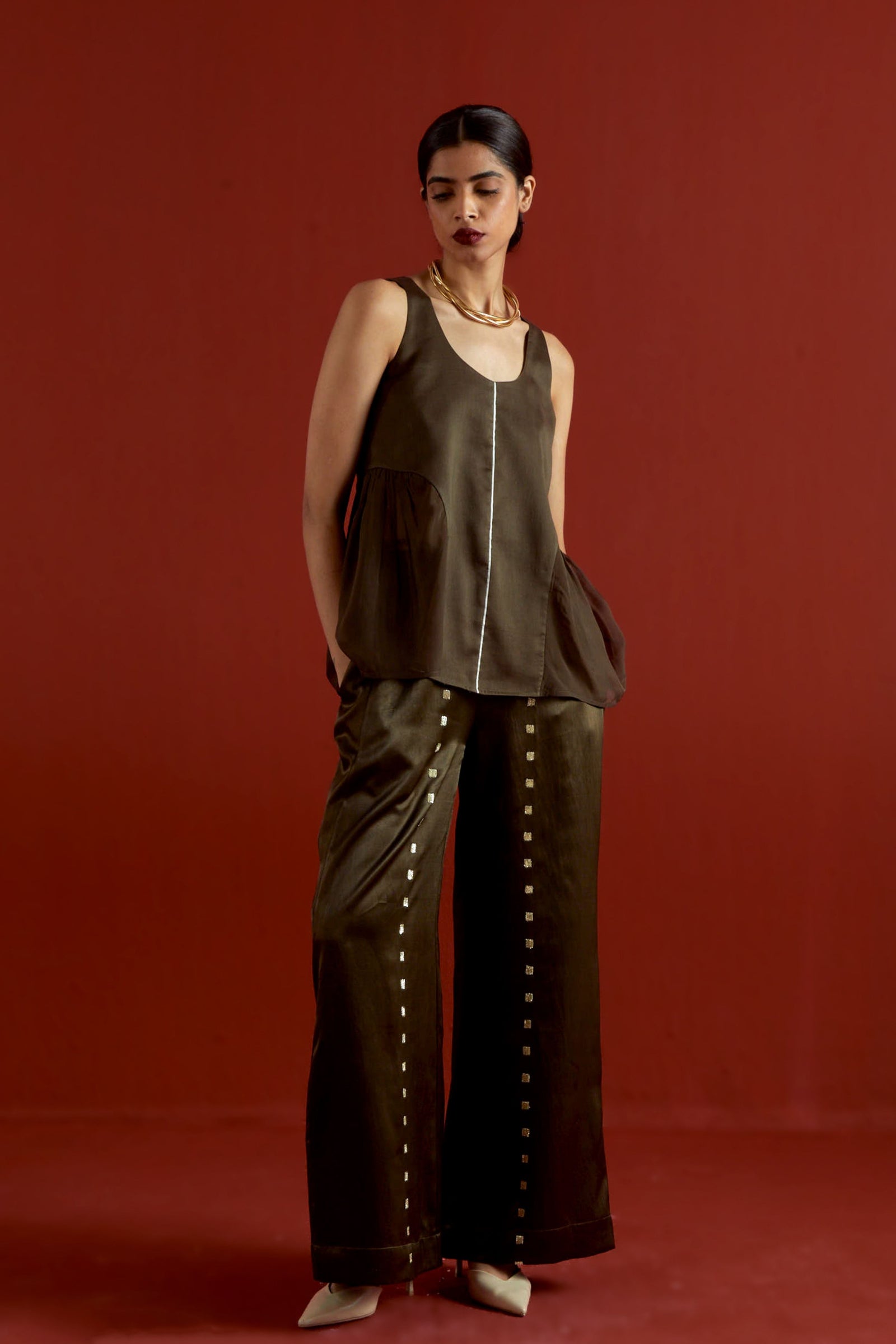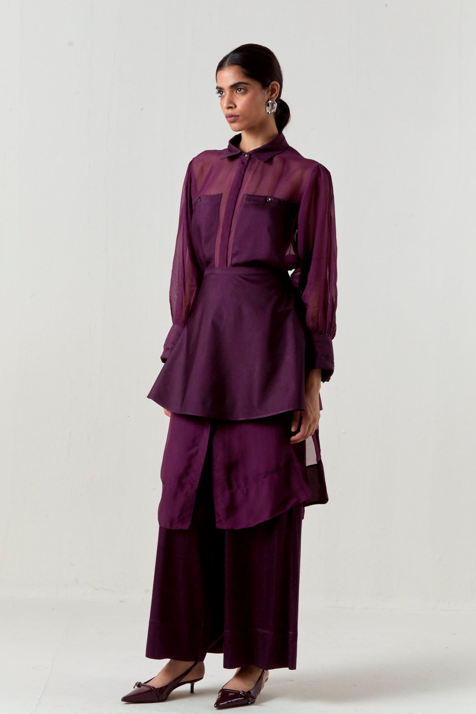 • Fringe pintuck bat sleeve shirt and front pleat bottom.