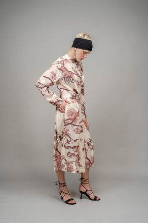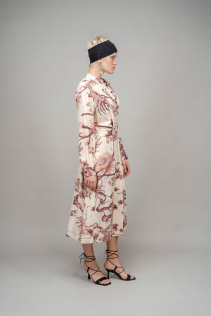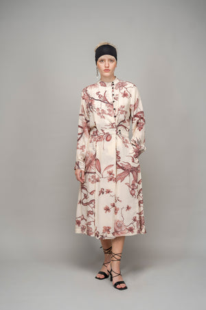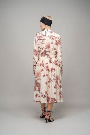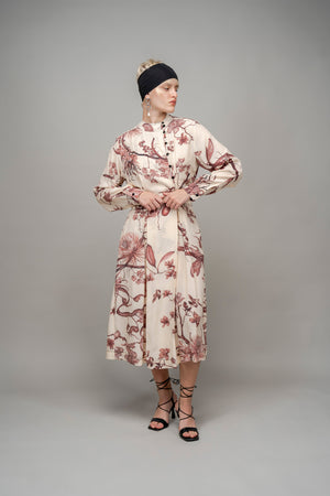 • This tailored dress is cut in 100% viscose crepe featuring seasons latest garden print in apricot highlighting a tailored fit with asymmetrical neck line closure and an adjustable belt datail with a box pleated skirt model wear size m model height is 5'8 garment length is 48''