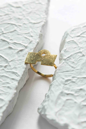 • An adjustable gold statement ring handcrafted in brass. Dimensions 1.3 Cm, 2 cm