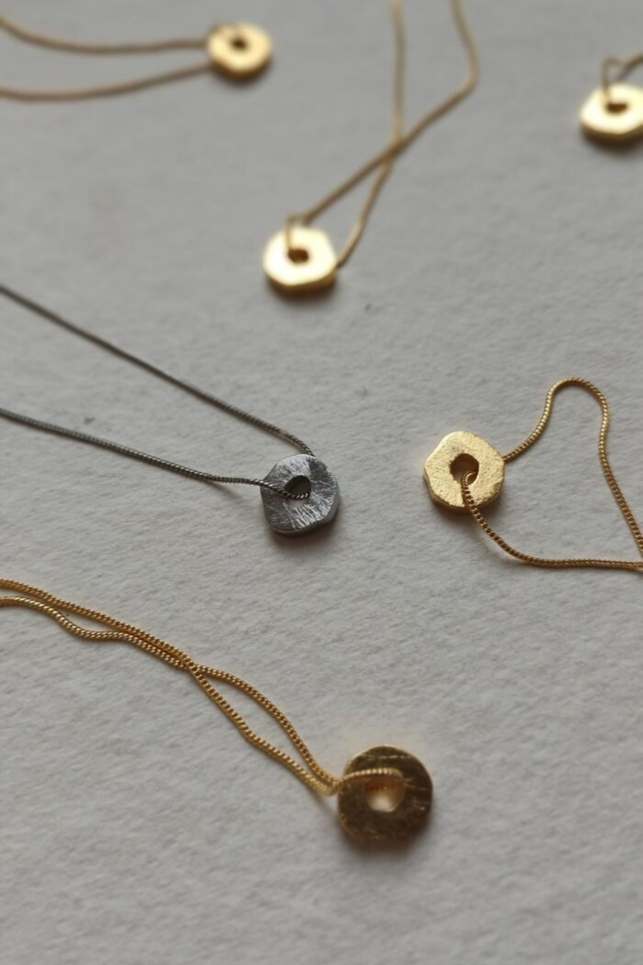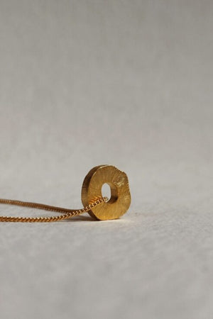 • A gold plated statement necklace with hollow circle pendant handcrafted in brass. Chain length 51 cm.
