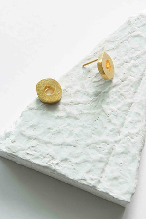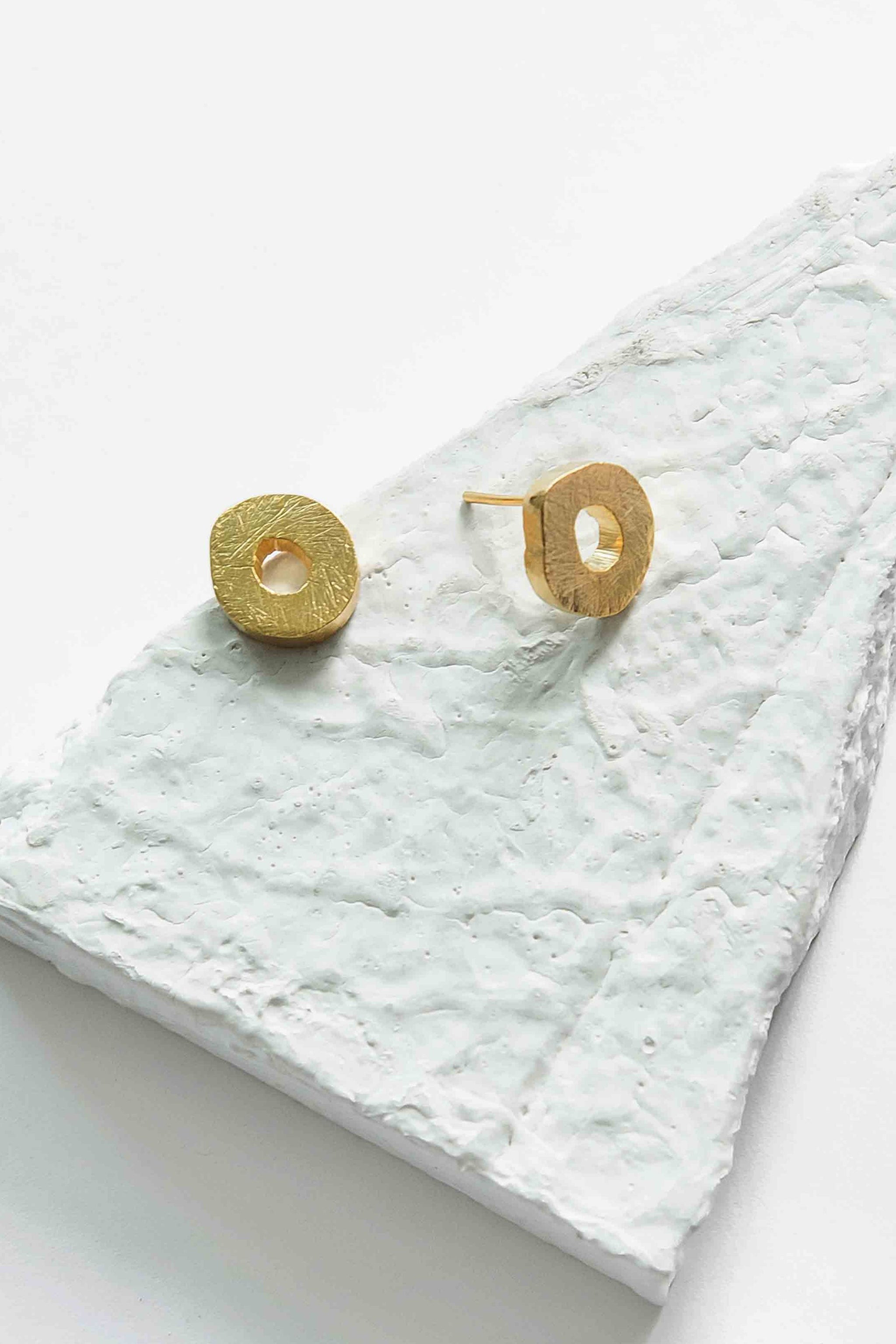 • A pair of gold plated statement hollow circular studs earrings handcrafted in brass. Height 1.5 Cm, width 1.5 Cm.