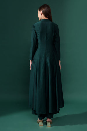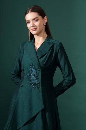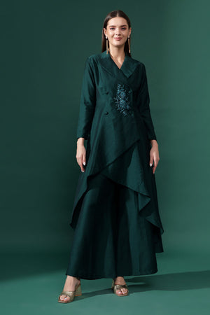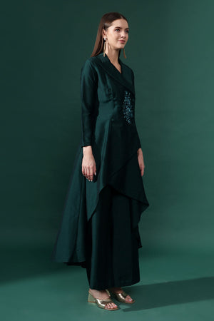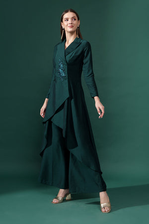 • Long asymmetric blazer tunic notch collar neck and front button closure 3/4th sleeves adorned with crystal hand embroidery paired with matching flared pants accented with delicate drapes.