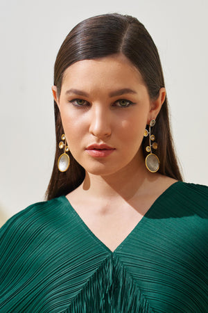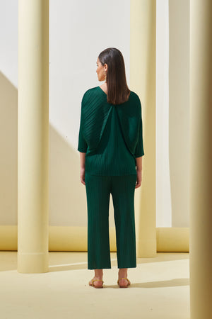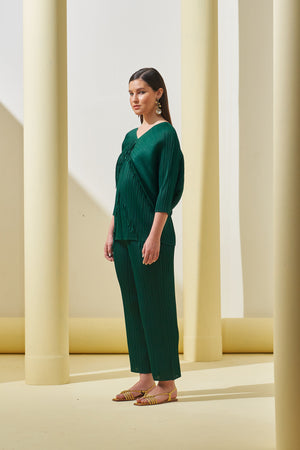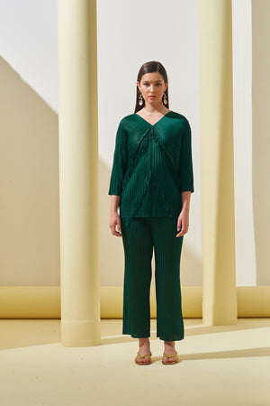 • Featuring green v neck and quarter sleeves top with layered fringes in pleated polyster base. It is paired with matching pleated culotte pants.