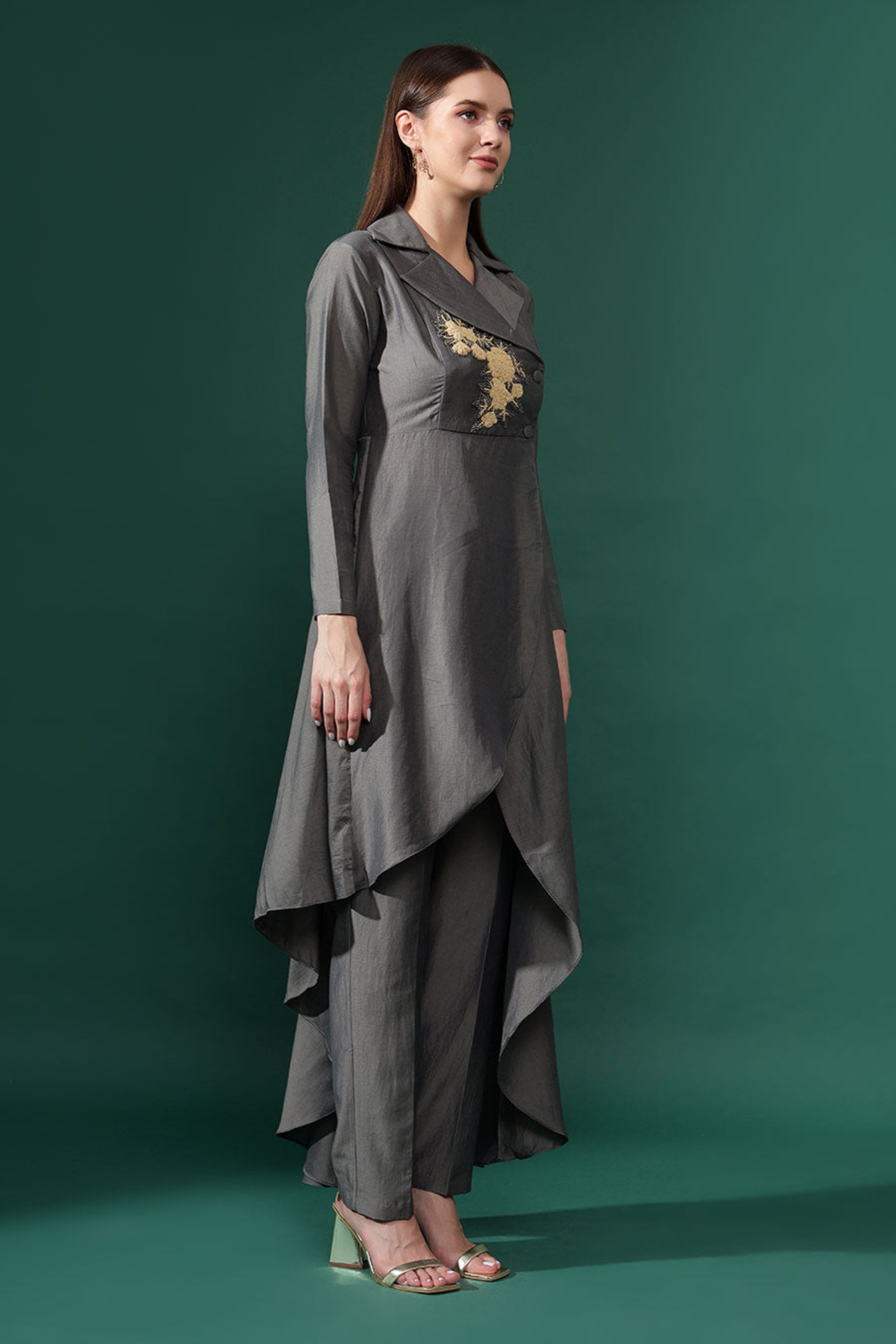 • Embellished blazer tunic notch collar neckline and front button closure full sleeves and asymmetric high low hemline embellished floral sequin hand-embroidery paired with matching straight pants with an elasticated back waist accented with delicate drapes.