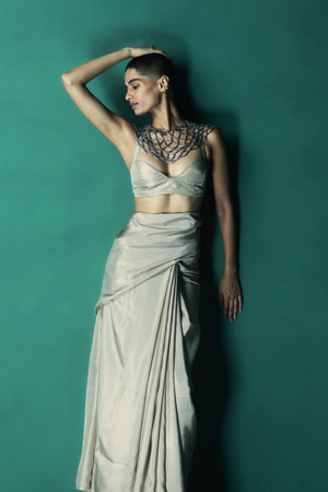 • An easy to drape, transeasonal sari in slate grey that can seamlessly flow from your everyday outfitting to evenings of celebration. Play up the lightweight silk with a statement blouse or a tonal cape for a striking ensemble that commands attention. The sari comes with unstitched blouse fabric. There will be additional charges for blouse stitching.