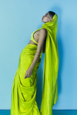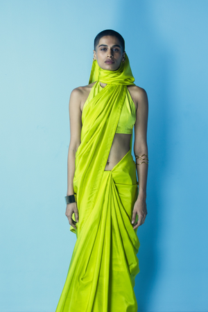 • An easy to drape, transeasonal sari in lime green that can seamlessly flow from your everyday outfitting to evenings of celebration. Play up the lightweight Organza with a statement blouse or a tonal cape for a striking ensemble that commands attention. The sari comes with unstitched blouse fabric. There will be additional charges for blouse stitching.