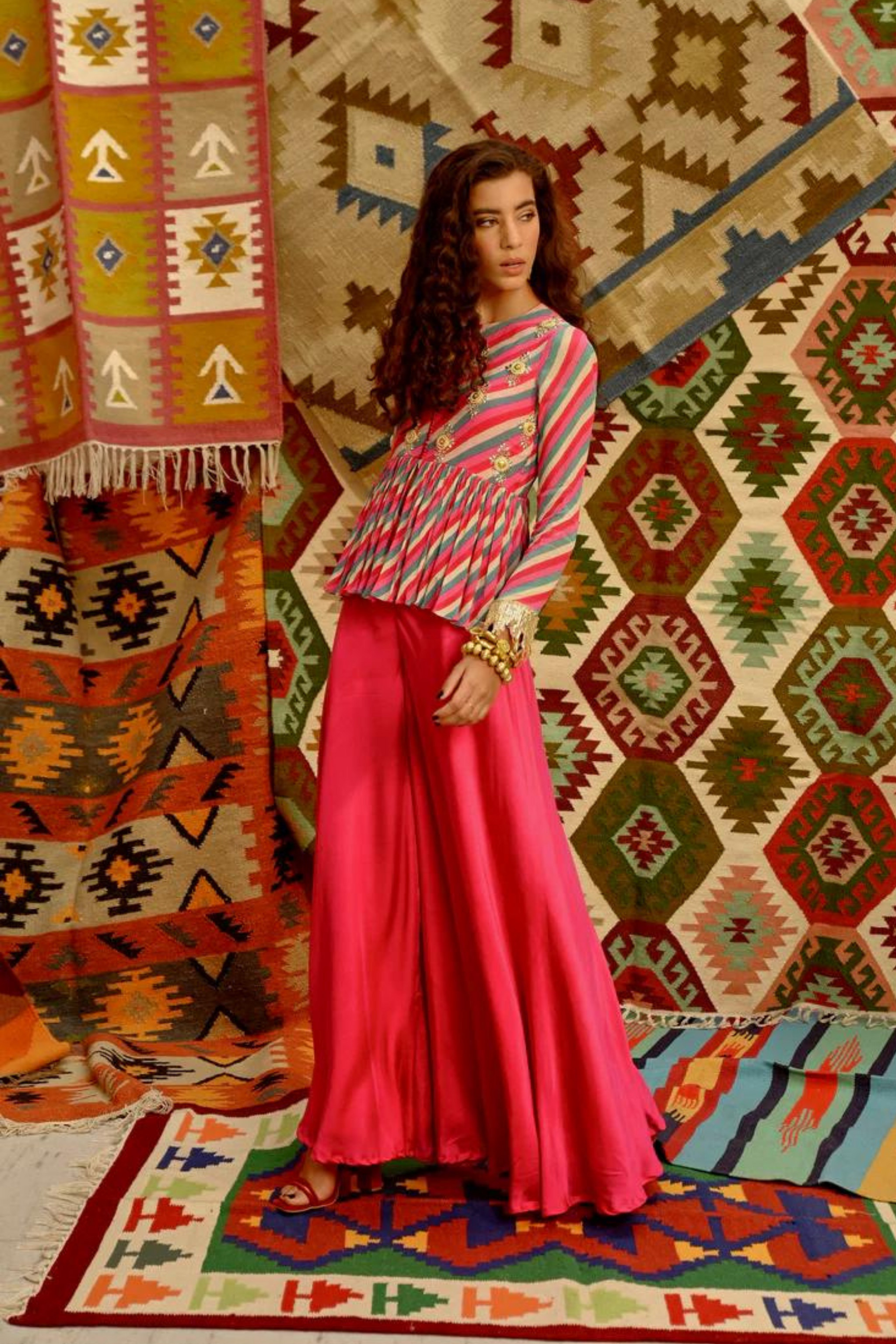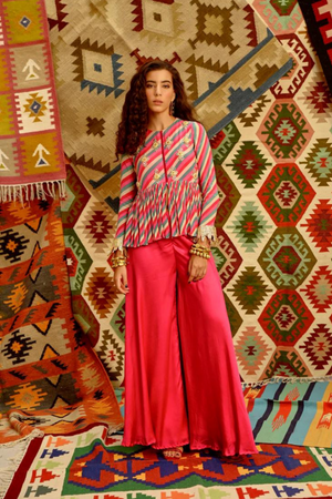 • Featuring our hot pink indi-leheriya tunic embroidered in metal flower beads, mirror work and gota fringe paired with flared pants