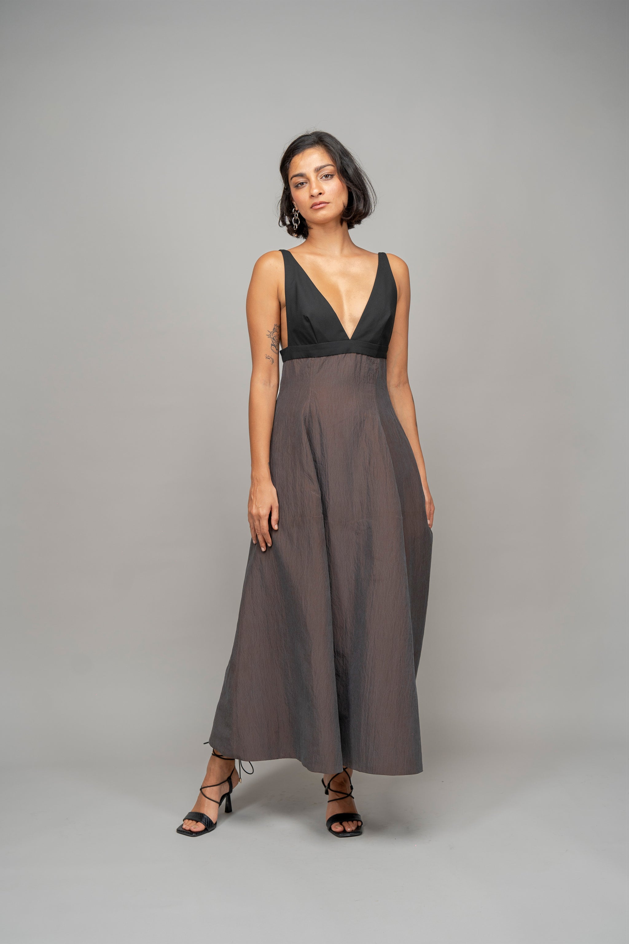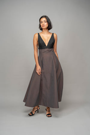 • This classic dress is a combination of suiting textile and taffta featuring a deep v neck with a side zipper highlighting its cinched waist and a flared out panelled model wear size s model height is 5'8 garment length is 55''