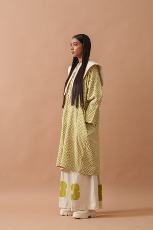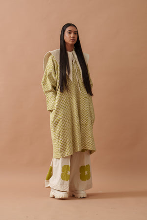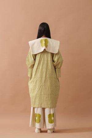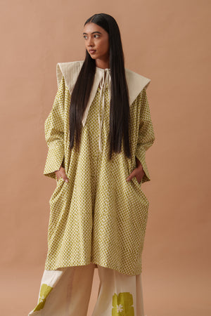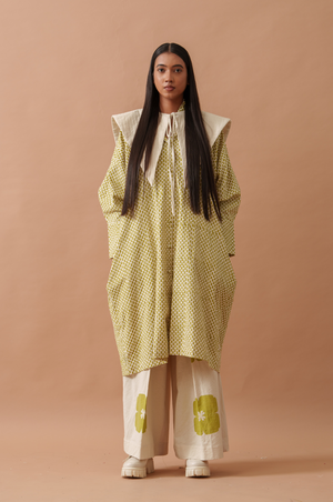 • Relaxed dress with with elongated cuffs made in hand-block printed broken stripes, comes with detachable quilted collar with hand-block printing.